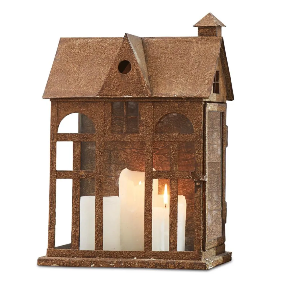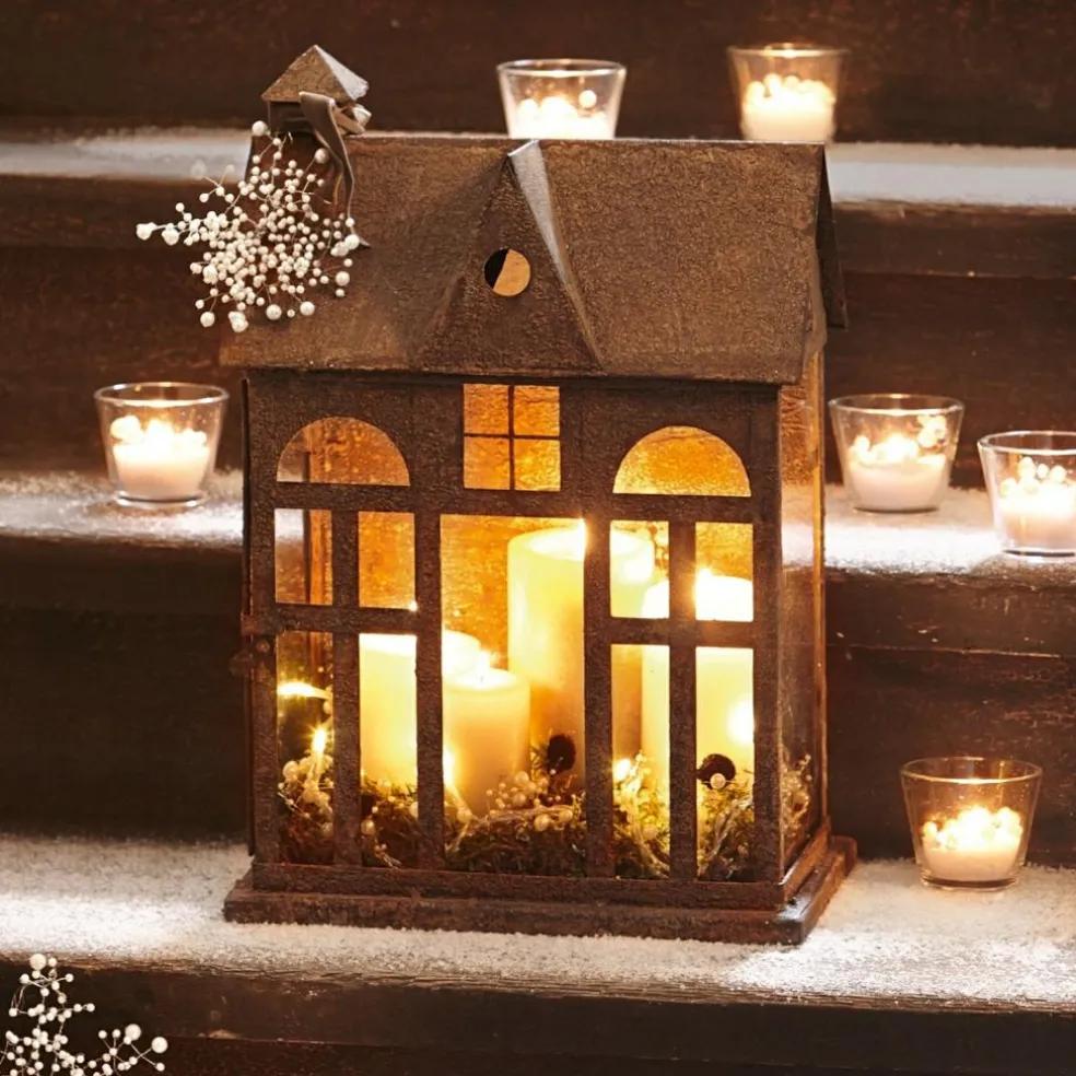 Genial einfach oder: Einfach genial! Schon eine einzelne Stumpenkerze lässt die eiserne Laterne in Form eines Hauses von innen heraus erstrahlen. Das einladende Licht, dass durch die Glaseinsätze der bodentiefen Fenster fällt, verbreitet im Handumdrehen Gemütlichkeit pur. Wer mag, darf gerne auch ein wenig tiefer in die Deko-Ideen-Kiste greifen und das Häuschen über die seitliche Öffnung etwas üppiger füllen. Ob Tannengrün, eine batteriebetriebene Lichterkette und ein paar kleine Tierfiguren, Tannenzapfen oder glitzernde Weihnachtskugeln: Fertig ist das Highlight Ihrer Festtagsdekoration – absolut individuell und einzigartig.