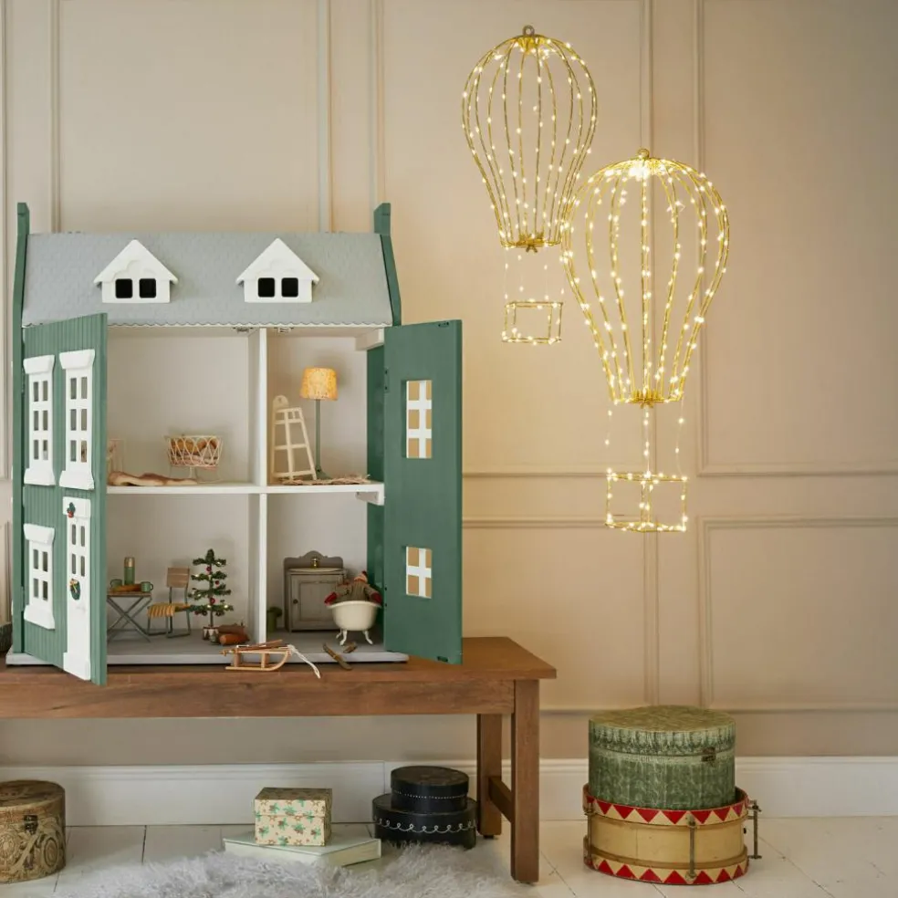 Wie ein stiller Moment in einer Winternacht, in dem die Welt kurz innehält – so wirken diese zarten Lichtobjekte in Ballonform. Aus feinem Draht kunstvoll geformt, erinnern sie an Heißluftballons, die in einer anderen Welt lautlos durch die Lüfte gleiten. Die goldfarbene Oberfläche fängt das Licht der 152 bzw. 240 warmweißen LEDs sanft ein und erzeugt ein beinahe märchenhaftes Schimmern. Dieses Set bringt nicht nur festliche Stimmung, sondern auch ein Gefühl von Leichtigkeit und Fantasie in Ihr Zuhause. Ob als Dekoration im Kinderzimmer, im Wohnzimmer oder als überraschendes Highlight im Flur – sie zaubern ein Lächeln auf jedes Gesicht, das sie erblickt.