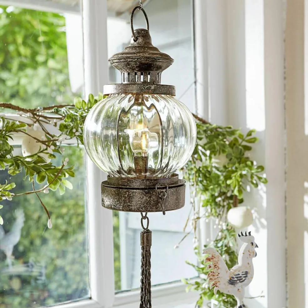 Diese handgemachte Laterne aus Metall und Glas sieht aus, als habe der Zahn der Zeit viele Jahre an ihr genagt. Ihre prächtige Patina ist wirklich einzigartig. Tatsächlich handelt es sich aber um einen fortschrittlichen Lichtspender mit energiesparender LED-Beleuchtung. Das schöne Stück verleiht jeder Umgebung einen ganz besonderen Charme, egal wo es hängt. Ein riesiger Vorteil: Die LED-Beleuchtung wird mit Batterien betrieben, sodass die schöne Optik nicht von störenden Kabeln getrübt wird. Außerdem kann sie dadurch wirklich überall genutzt werden. Ein stabiler Eisenring macht die Anbringung an einem Haken kinderleicht. So kann sie überall nach Belieben aufgehängt werden. Am unteren Ende kann die Leuchte geöffnet werden und Batterien unsichtbar eingelegt werden.