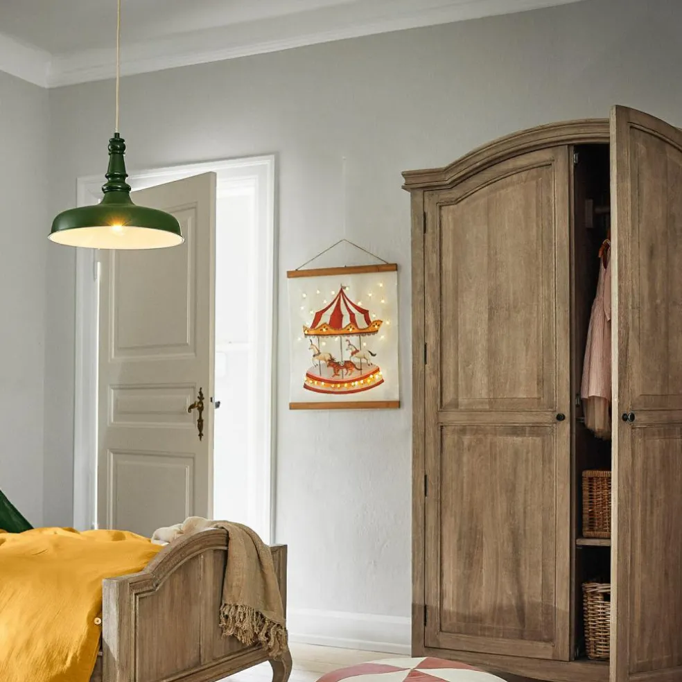 Tauchen Sie ein in die zauberhafte Welt des Karussells mit diesem einzigartigen LED-Wandbild. Der liebevoll bedruckte Baumwollstoff in warmen, erdigen Tönen und die detailreiche Darstellung der Karusselltiere zaubern ein Lächeln auf jedes Gesicht. Die Aufhängung aus natürlichem Tannenholz und Jute verleiht dem Bild einen rustikalen Charme, während die beiden integrierten Lichterketten für ein sanftes, beruhigendes Licht sorgen. Dieses Wandbild ist nicht nur ein Blickfang, sondern schafft auch eine einladende und gemütliche Atmosphäre, ideal für das Kinderzimmer.