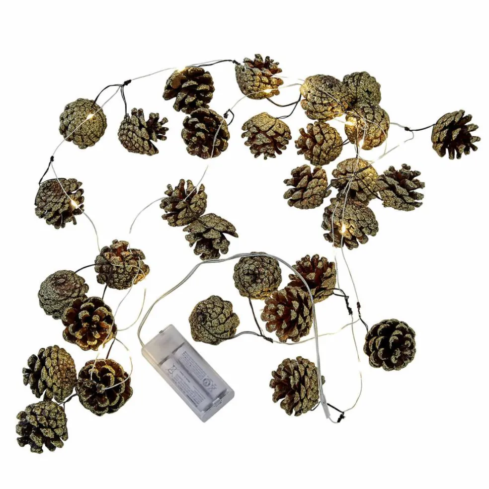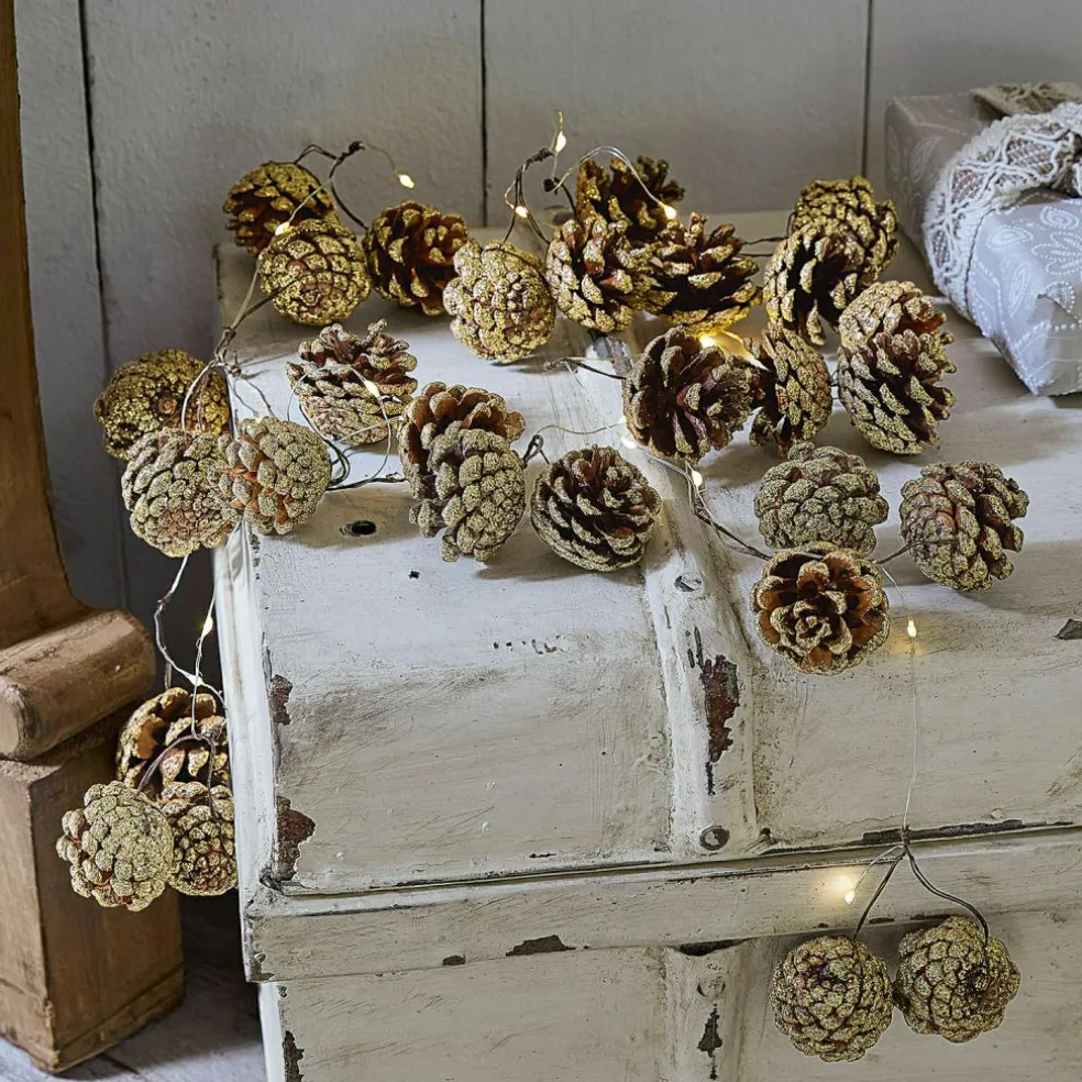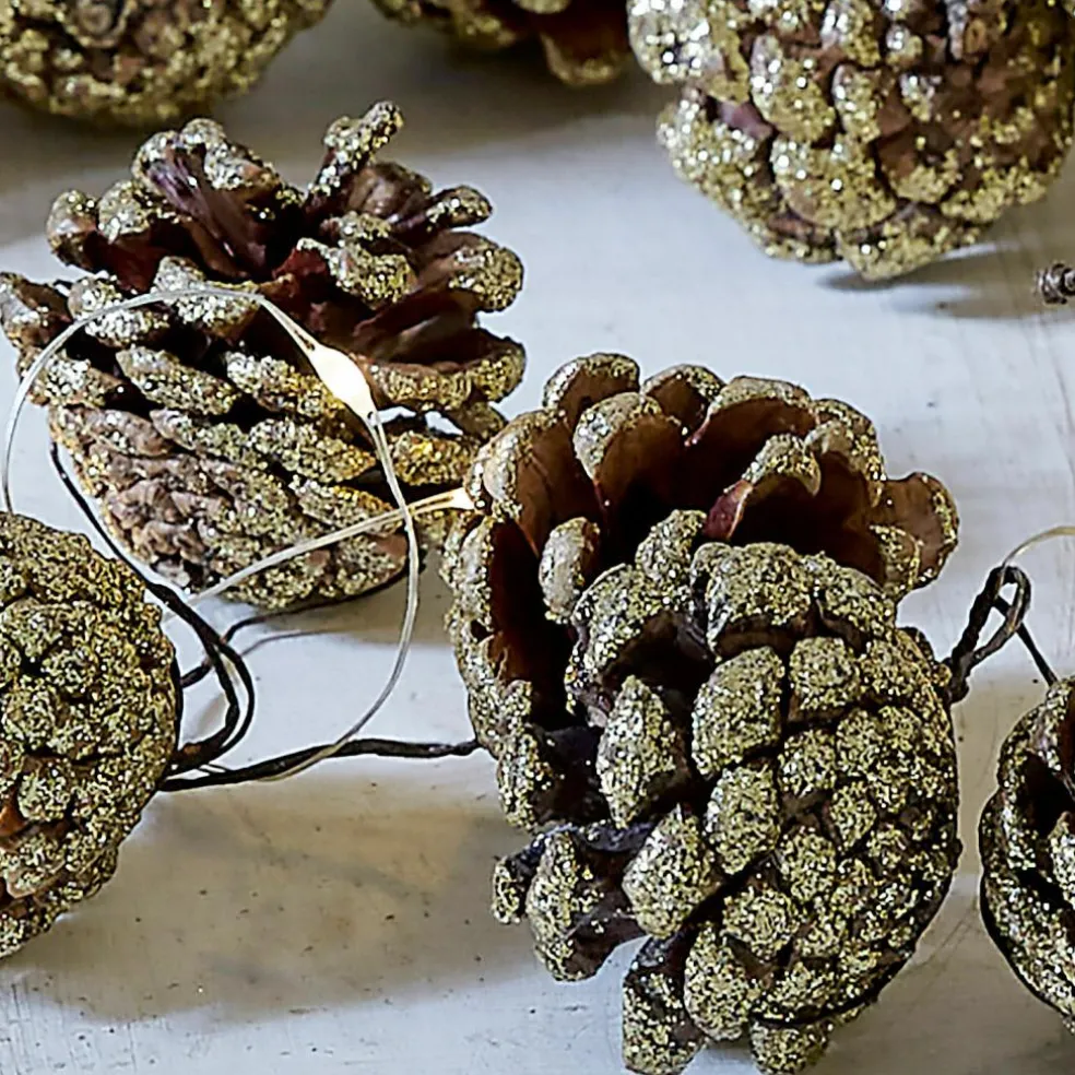 Erleben Sie eine richtig gemütliche Illumination und rustikales Chalet-Flair. Diese schöne Lichterkette ist mit echten Kiefernzapfen geschmückt und gibt Ihrem Zuhause den Hauch einer heimeligen Hütte. Die Zapfen könnten direkt aus dem Winterwald gesammelt sein. Sie erhalten einen hübschen Glanz durch ein besonderes goldfarbenes Finish. Mit 20 warmweißen LEDs bringt sie zusätzlich Gemütlichkeit mit. Am Bett oder im Wohnzimmer wird es hiermit so richtig kuschelig, und auch in der Küche lässt es sich hiermit bei schöner Stimmung kochen. Vielleicht am Fenster platziert oder um einen Dachbalken drapiert, kann dieses freundliche Design seinen ganzen Charme sprühen lassen.