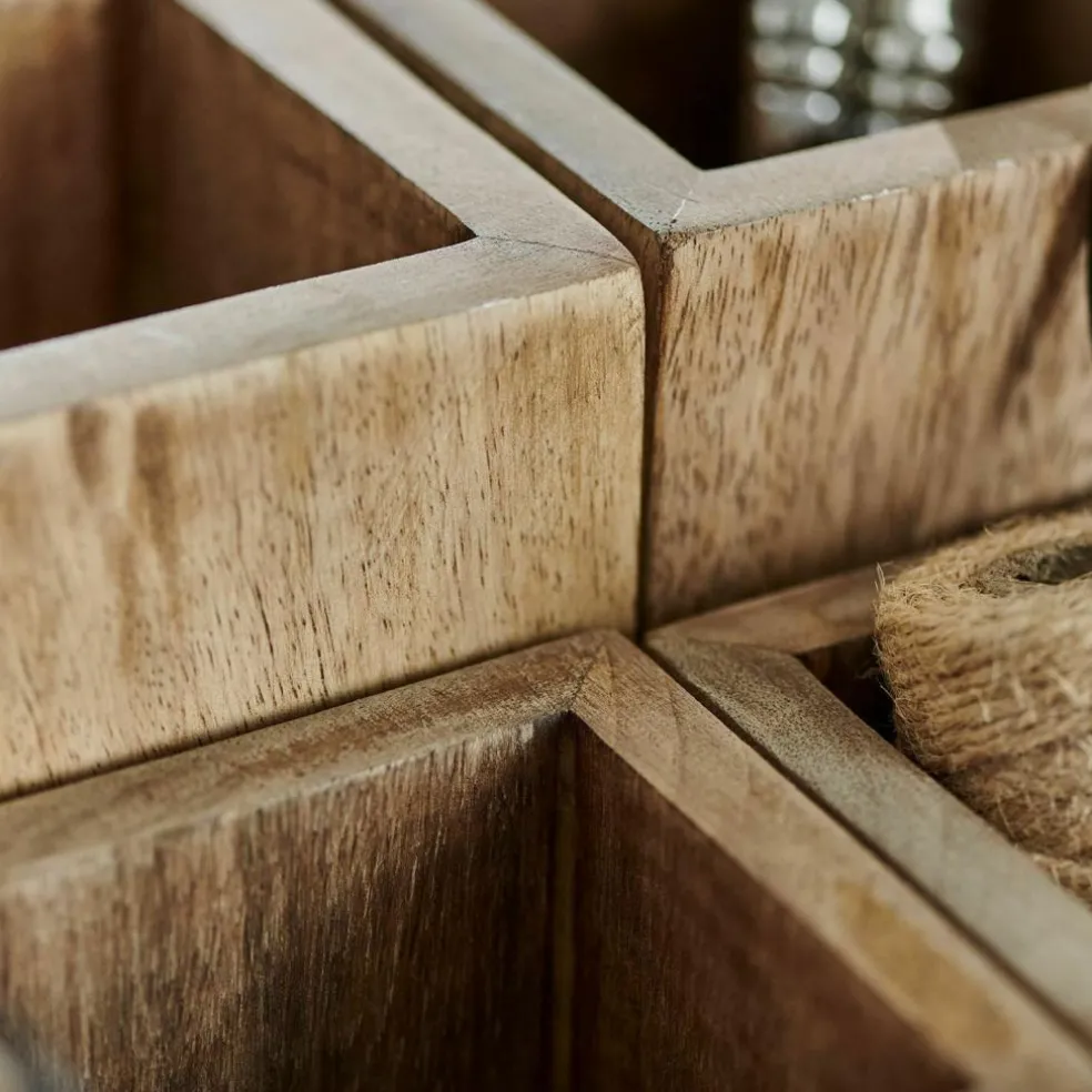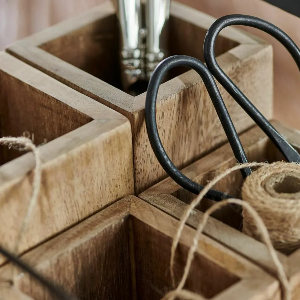 Dieses zeitlos schöne Accessoire ist ein echtes Multitalent und eine wahre Bereicherung für Ihr Zuhause. Er kombiniert ein kunstvoll geformtes Eisengestell mit vier herausnehmbaren Kästchen aus natürlich schönem Mangoholz. Die feine Maserung ist ein echter Blickfang und bildet einen charmanten Kontrast zum dunklen Gestell. Das hochwertige Schmuckstück bietet Ihnen eine Vielzahl von Möglichkeiten: Am Esstisch können Sie Besteck und Servietten darin platzieren, im Büro alle Schreibutensilien dekorativ organisieren, und im Badezimmer lassen sich Schminkutensilien griffbereit aufbewahren. Oder Sie begeistern Ihre Gäste, indem Sie essbare Blüten und Kräuter in den Fächern arrangieren und so eine einzigartige Tischdekoration schaffen, die je nach Jahreszeit verändert werden kann.