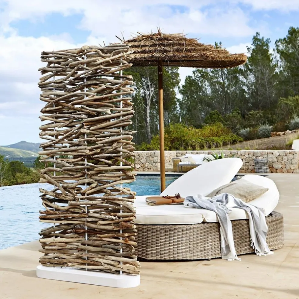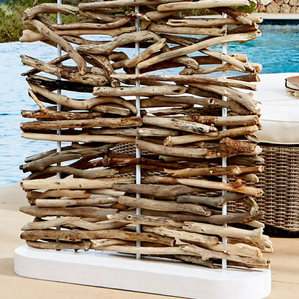 Dieser exklusive Paravent ist aus erlesenem Treibholz gefertigt, das sorgsam ausgewählt wurde. Holen Sie sich damit natürliches und maritimes Flair in Ihre grüne Oase. Auch edles Mahagoni-Holz und Eisen wurden dafür verarbeitet. Die Treibholz-Stücke sind kunstvoll an Metallstangen befestigt und bieten so einen schmückenden und dezenten Sichtschutz mit naturnaher Optik. Der Paravent ruht stabil auf einem hölzernen Fuß. Genießen Sie Ihre Privatsphäre im Garten und auf der Terrasse und freuen Sie sich auch über ein wenig zusätzlichen Schatten. Eleganter Outdoor-Luxus für Ihr Zuhause.