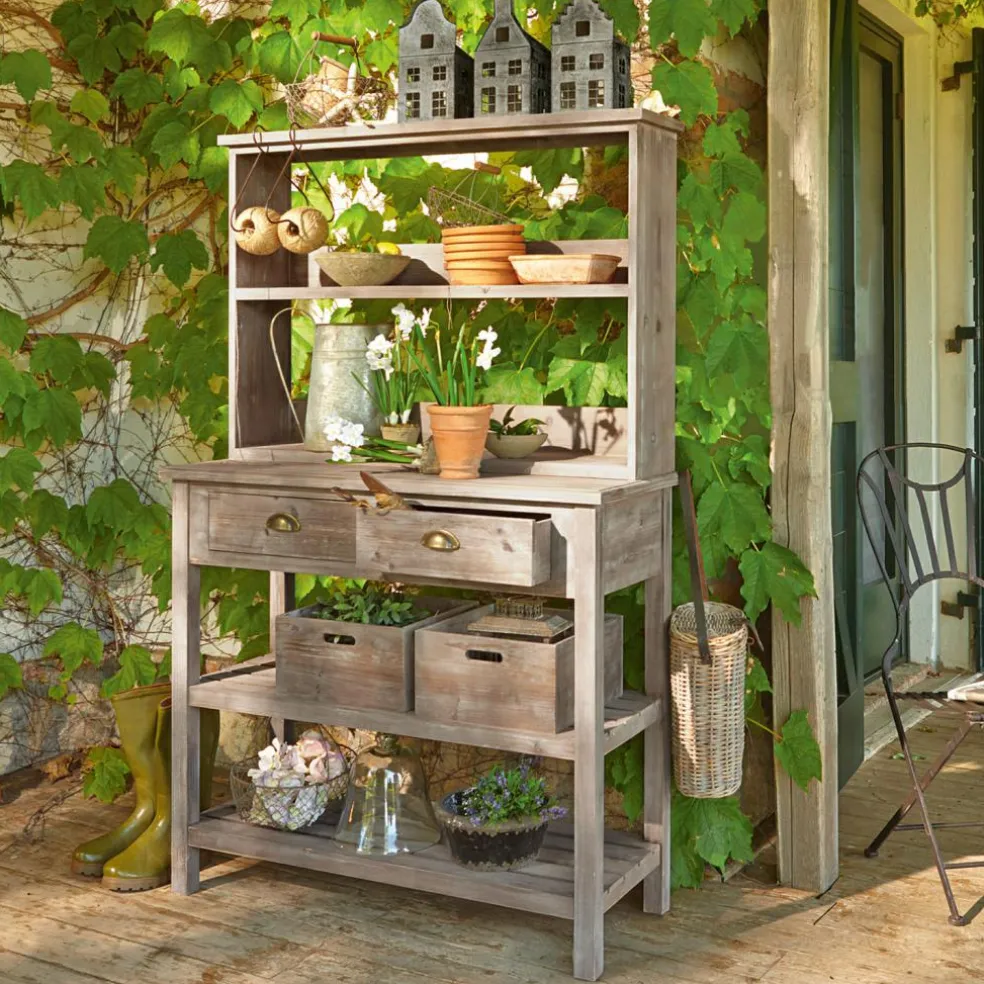Als dekorativ und praktisch zugleich entpuppt sich dieser Pflanztisch aus handbearbeitetem Holz. Das Outdoor-Möbel mit Antik-Lasur bietet zudem auf kleiner Fläche jede Menge Stauraum und ausreichend Arbeitsfläche zum Umtopfen und Pflegen kleinerer Pflanzen. Insgesamt vier Ablageböden, zwei Schubladen und zwei herausnehmbare Holzkisten helfen derweil beim Ordnung halten und effektivem Arbeiten. Ein Tipp: Damit Sie möglichst lange Freude an dem hölzernen Pflanztisch mit natürlichem Charme haben, stellen Sie ihn etwas geschützter auf – das schöne Tannenholz verträgt auf Dauer keinen direkten Regen oder zehrende Wochen unter einer Schneehaube. Eine andere Idee: Eine Abdeckplane für Gartenmöbel umfunktionieren – klein genug ist der Pflanztisch dafür allemal.