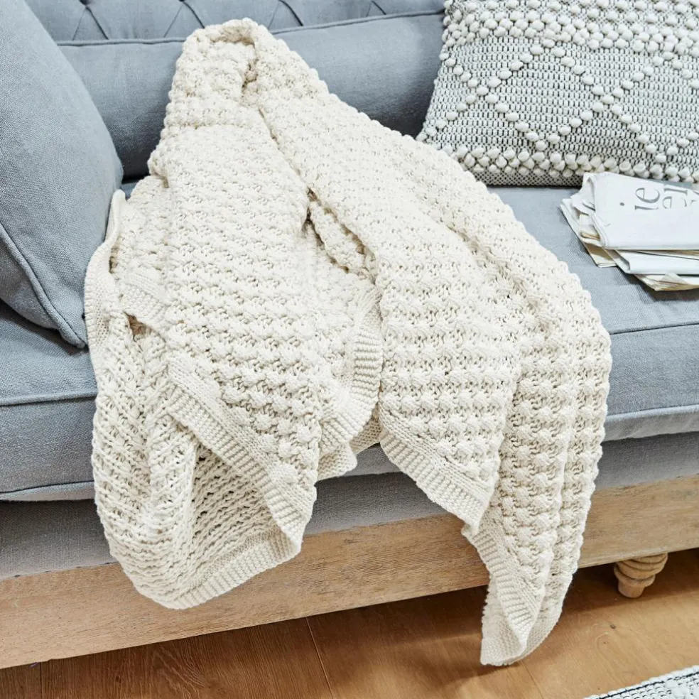 Als schmückendes Wohnaccessoire die Couch oder den Sessel in Szene setzen, eine Stilrichtung unterstreichen oder einfach nur als gemütlicher Wärmespender fungieren – das sind nur einige Möglichkeiten, die Plaids so unverzichtbar machen. Denn sie sind wahre Allroundtalente, die Ihren kreativen Wohnideen viel Ausdruck verleihen. Dieses edle Strickplaid überzeugt nicht nur mit seiner spannenden Textur, sondern auch mit seinem fantastischen Komfort. Die lebendige Strickstruktur, auch Popcorn-Muster genannt, ist ein besonders aktueller Trend und verleiht der Decke eine faszinierende Optik. Dabei setzt die gerippte Abschlussblende rundum einen wirkungsvollen Rahmen. Durch die naturreine, weiche Baumwollqualität ist das Plaid ein Genuss auf der Haut. Schmiegen Sie sich ein in diese Decke und genießen Sie die wohlige Wärme. Zurückhaltend in der Farbgebung passt sie sich jedem Wohnkonzept perfekt an.