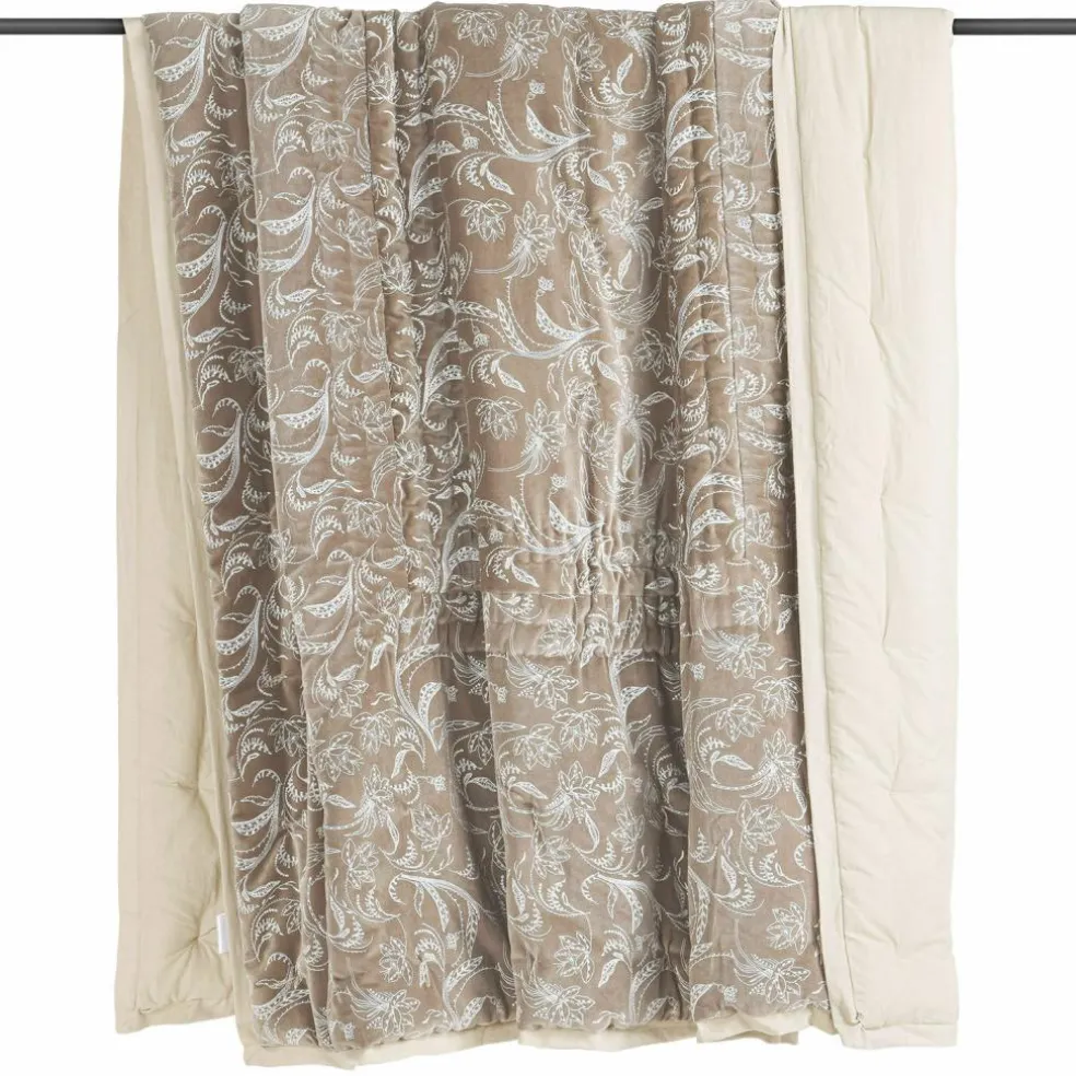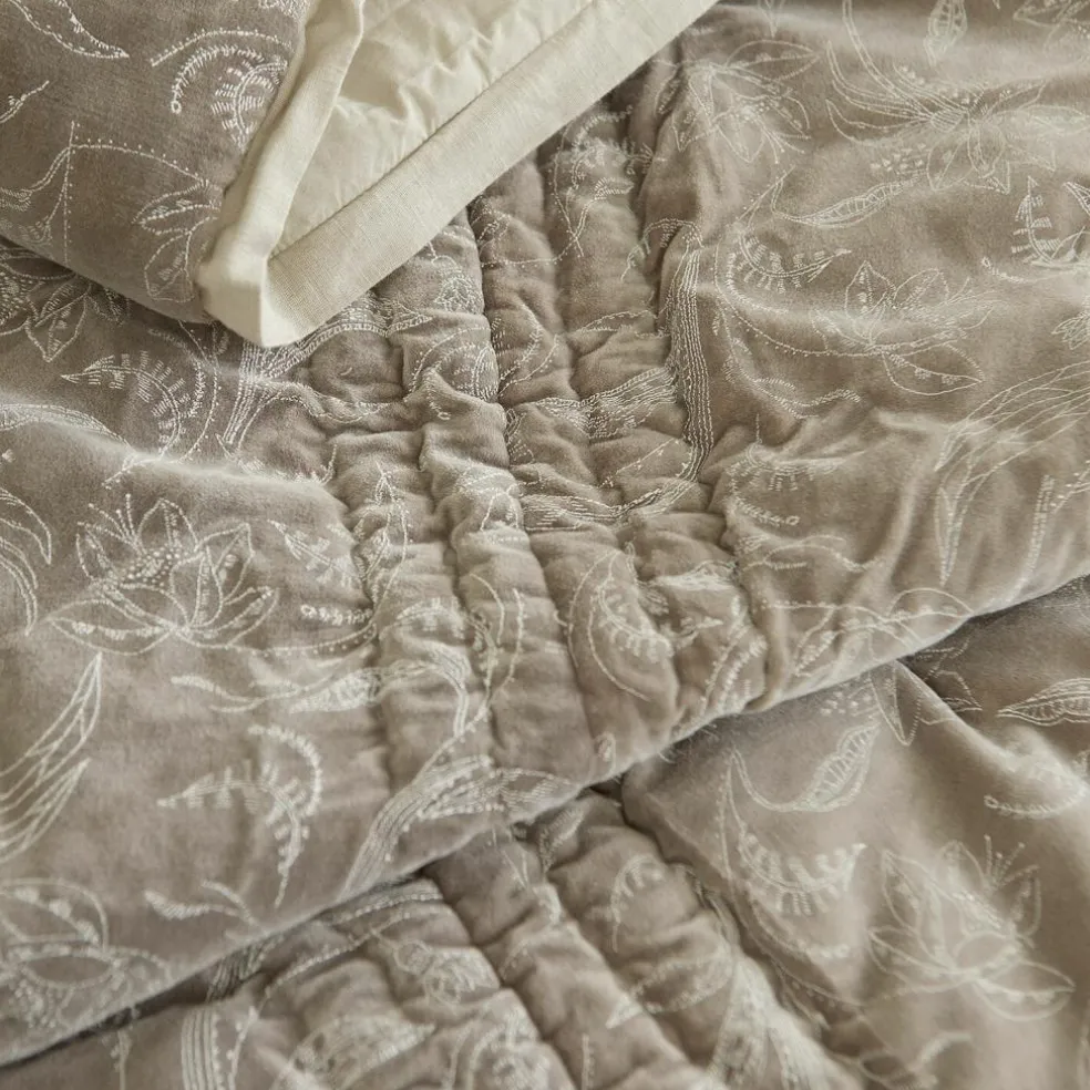 Elegante Ranken, zierliche Blätter und zauberhafte Blüten bilden ein botanisches Arrangement, das als filigraner Print die Vorderseite dieser Tagesdecke schmückt, wobei die sanften Weiß-Nuancen dafür sorgen, dass im Schlafraum weiter das ruhige, harmonische Farbklima herrscht, in dem wir Entspannung und erholsamen Schlaf finden. Der Quilt schmeichelt aber nicht nur dem Auge, sondern verwöhnt alle Sinne – mit einer Vorderseite aus nobel schimmerndem, streichelweichem Baumwollsamt und einer Rückseite aus hautfreundlicher Baumwolle in uni Beige. Wie Sie es von einem klassischen Quilt erwarten können, ist er leicht gefüttert und wurde Ton-in-Ton von Hand gequiltet, so dass alle Stofflagen sicher miteinander verbunden sind. Eine umlaufende Bordüre aus edlem Leinen-Baumwolle-Mix macht die textile Kreation perfekt. Der Quilt schmückt als elegante Tagesdecke Ihr Bett, er legt sich aber auch wie ein wärmender Hauch über Sie, wenn Sie ihn an kühlen Abenden als Kuscheldecke mit aufs Sofa nehmen. Noch komfortabler wären diese Mußestunden mit einem weichen Kissen im Rücken? Bitte sehr: Im gleichen Look-and-Feel wie den Quilt gibt’s eine Kissenhülle im 2er Set (23561).