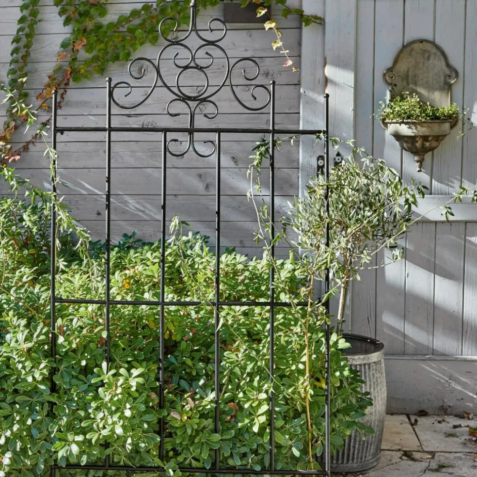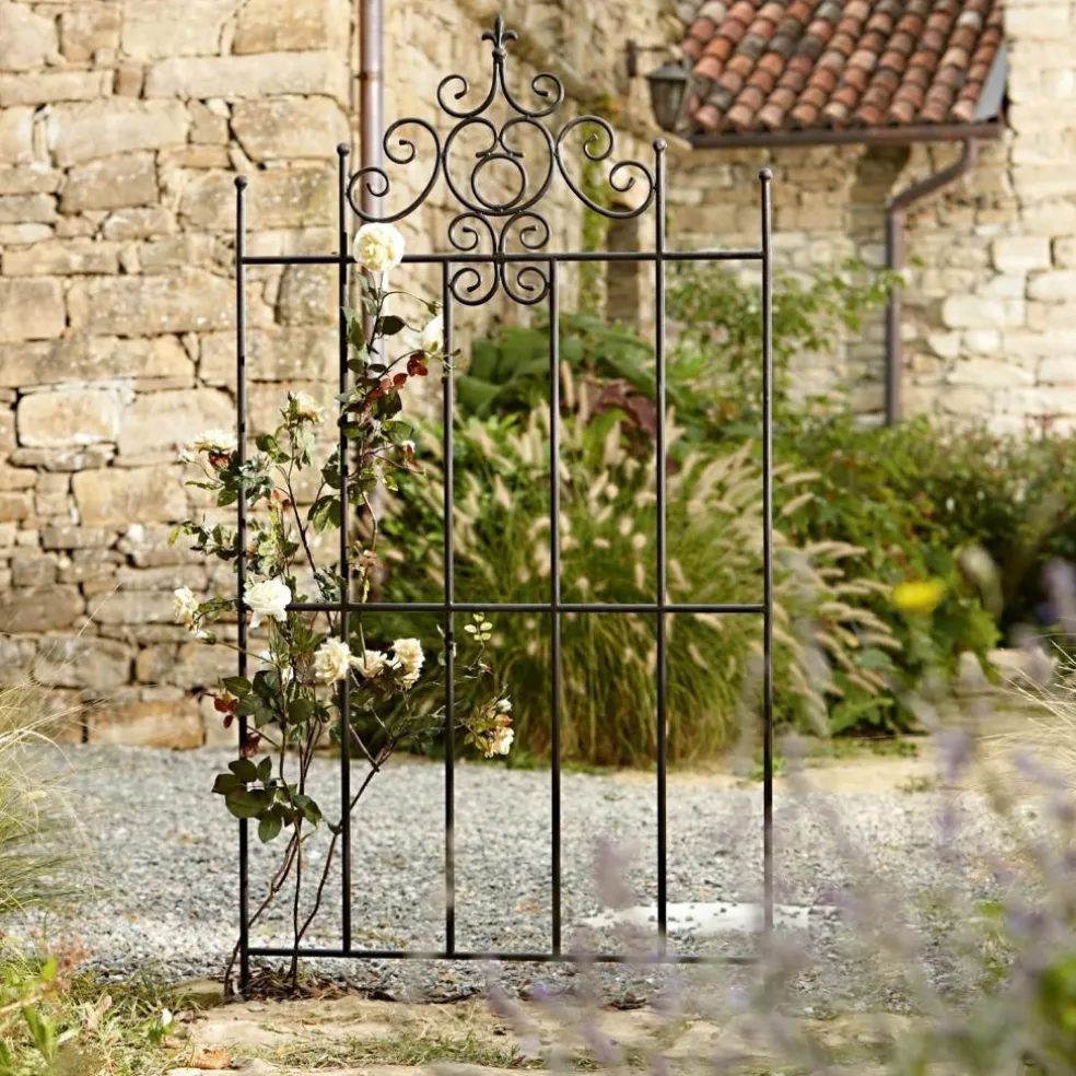 Durch die stattliche Größe schafft das Gitter eigene Räume im Garten und kann auch als Sichtschutz zum Nachbarn eingesetzt werden. Sehr dekorativ auch an der Hauswand als Rankhilfe für Kletterpflanzen oder als eigenständiges Deko-Element. Mit kunstvollem Ornament aus Eisen gefertigt. Bei kräftigen Pflanzen eventuell noch zusätzlich an der Hauswand befestigen.