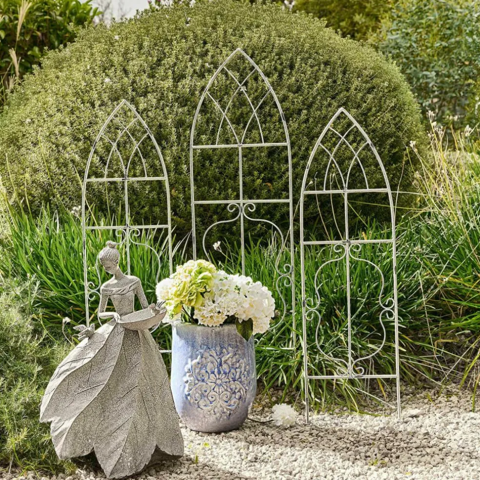 Dieses Rankhilfe-Set ist mehr als nur eine Stütze für Ihre Pflanzen – es ist ein dekoratives Highlight für jeden Garten. Die schlanken Metallgestelle mit ihren zarten Ornamenten und gotischen Bögen wirken wie aus einem englischen Landhausgarten entnommen. Das Antikgrau-Finish unterstreicht den nostalgischen Charakter und fügt sich harmonisch in jede Außenumgebung ein. Ob vor einer Mauer platziert oder mitten im Blumenbeet – die Rankhilfen sind der ideale Partner für Kletterrosen, Efeu oder andere Rankpflanzen, die sich kunstvoll um die geschwungenen Streben winden können. Praktisch und dekorativ in einem, laden sie zum Träumen und Verweilen ein.