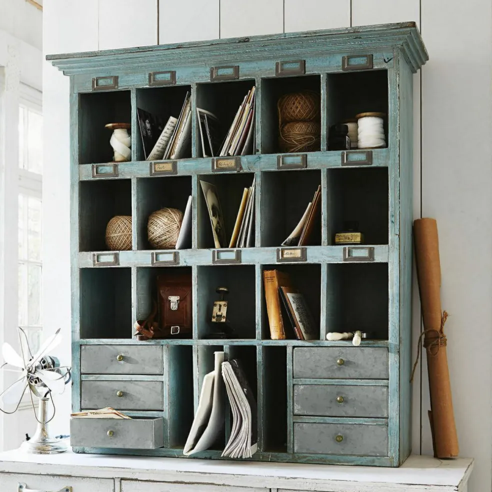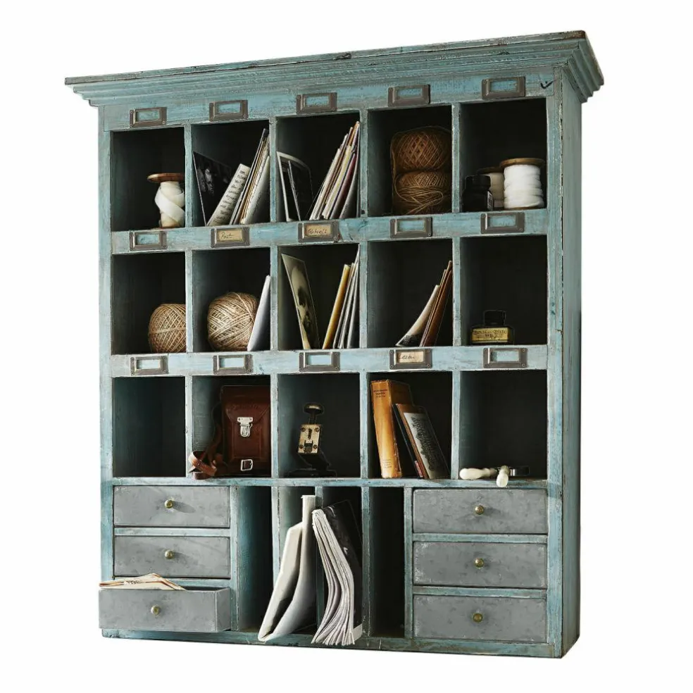 Geht dieses Schmuckstück noch als Organizer durch oder müsste man es bereits als Regal bezeichnen? Egal, wie die Antwort auch ausfallen mag, zählt am Ende ja doch nur wie man das attraktive Kleinod zu Hause einsetzen möchte. Reines Tannenholz kommt bei der Herstellung zum Einsatz, wobei kleine Schildchenhalter aus Metall charmante Akzente setzen. 19 offene Fächer bieten ausreichend Platz für unsere Siebensachen, zusätzlich wurden sechs Schubladen integriert. Diese heben sich auch farblich deutlich ab und machen den authentischen Vintage-Look komplett.