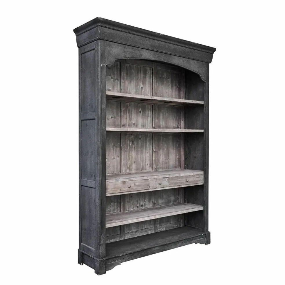 Dieses Regal ist kein leiser Mitspieler, sondern eine eindrucksvolle Erscheinung – hoch gewachsen und zugleich bodenständig. Es erinnert an jene Stücke, die einst Wände historischer Gutshäuser zierten: groß, massiv und gemacht für Generationen. Die Kombination aus schwarzem Antik-Finish und naturfarbenem Innenleben schafft eine reizvolle Tiefe. Durch seine großzügige Höhe rückt es Bücher, Vasen oder Geschirr stilvoll ins Rampenlicht – und bietet zugleich Stauraum in den kleinen, mittig platzierten Schubladen. Die geschwungene Abschlusskante und die sichtbare Holzstruktur verleihen ihm ein nostalgisches Flair, das sich perfekt in moderne Landhauskonzepte einfügt. Ein Regal, das mehr als nur praktisch ist – es prägt den Raum.