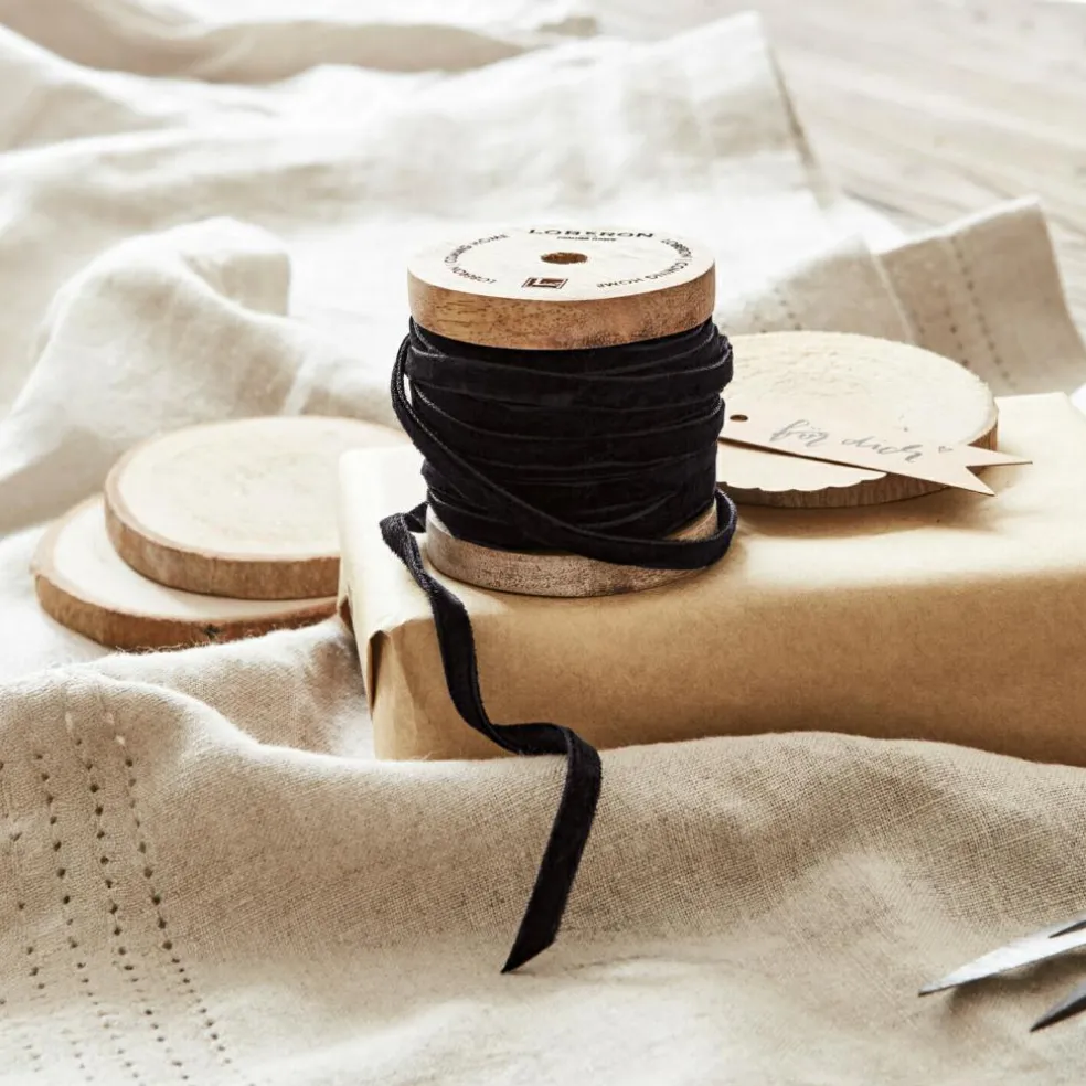 Wer kennt sie nicht, die kleinen praktischen Haushaltshelfer, die ihren Charme durch die Fertigung aus Kunststoff schnell wieder verlieren. Ganz anders diese edle Samtband-Spule, deren Look nostalgisches Flair versprüht. Mit einer massiven Holzspule aus Mangoholz und einem komplett abrollbaren, weichen Samtband präsentiert sie sich so schön, dass man sie immer gerne zur Hand nimmt. Und die Freude am Verzieren und Dekorieren steigert sie um ein Vielfaches. Das LOBERON-Branding ist stilvolles Extra und sorgt dafür, dass die Herkunft des Schmuckstücks kein Geheimnis bleibt. Ihre Verwendungsmöglichkeiten sind nahezu unbegrenzt: Sie können damit Geschenken den letzten Schliff geben, kreative Deko-Arrangements veredeln oder Stoffservietten hübsch binden. Das Band ist ganze 10 Meter lang, was ausreichend Länge für viele Ideen bietet. Auch als 4er Set unter 21329 erhältlich.