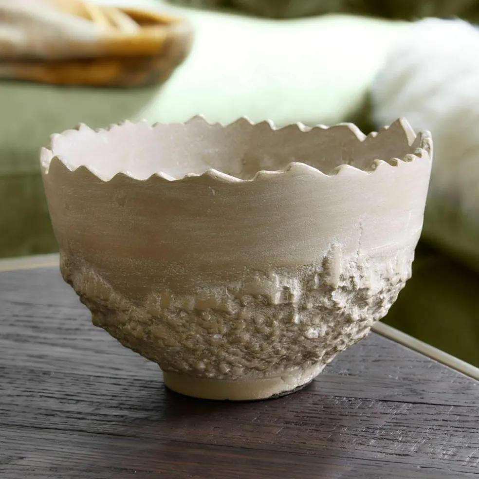 Manche Objekte ziehen die Blicke durch ihre Formensprache magisch an – so wie dieses Schalen-Duo mit seinem rauen, fast archaischen Charme. Der wellige Rand erinnert an sanft geformte Tonarbeiten, während die Oberfläche bewusst unperfekt wirkt und so an handmodellierte Kunststücke erinnert. Der naturbelassene Farbton unterstreicht die ruhige, organische Anmutung. Platzieren Sie sie auf einem Regal, dem Couchtisch oder im Eingangsbereich – ob leer oder mit dekorativen Inhalten bestückt: Diese Schalen verleihen Ihrer Einrichtung eine Prise Atelier-Flair. Bitte beachten Sie, dass die Schalen nicht lebensmittelecht sind und nur zur Dekoration verwendet werden sollten.