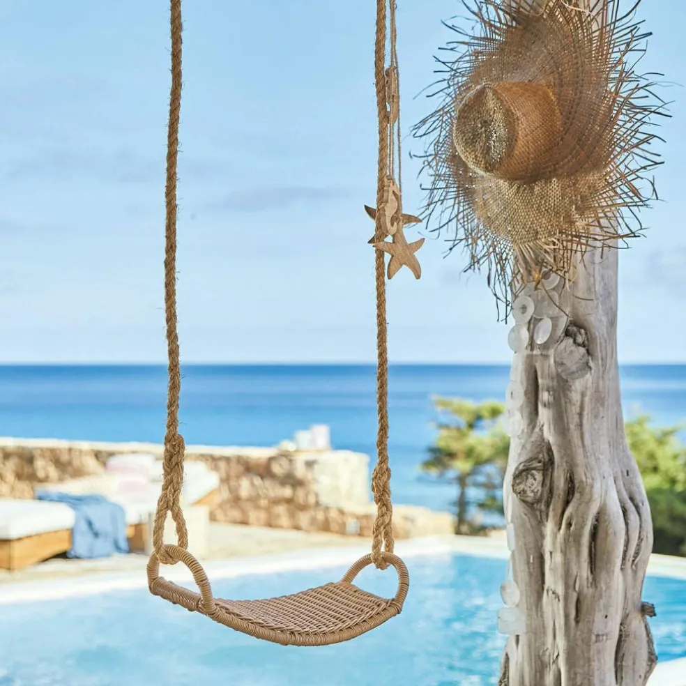 Wollen wir nicht manchmal alle wieder Kind sein und die Seele baumeln lassen? Diese wunderhübsche Schaukel in natürlicher Optik erinnert an glückliche Tage im Garten. Einfach losschaukeln und den Alltag vergessen – das ist pure Lebensfreude, und dieses tolle Gefühl können Sie sich mit dieser attraktiven Schaukel ganz einfach nach Hause holen, ob für sich selbst oder die Kleinen. Das schicke Design besteht aus wetterfestem Polyrattan mit einer Aufhängung aus Jute und Eisen. An einem Baum im Garten oder an stabiler Stelle auch innen befestigt holen Sie sich hiermit verspielten Charme in Ihr Heim. Erleben Sie selbst, wie beim Schaukeln kindliche Freude aufkommt – so leicht kann das Leben sein! Diese hübsche Schaukel dürfte auch bei Ihren Gästen zum Star werden.