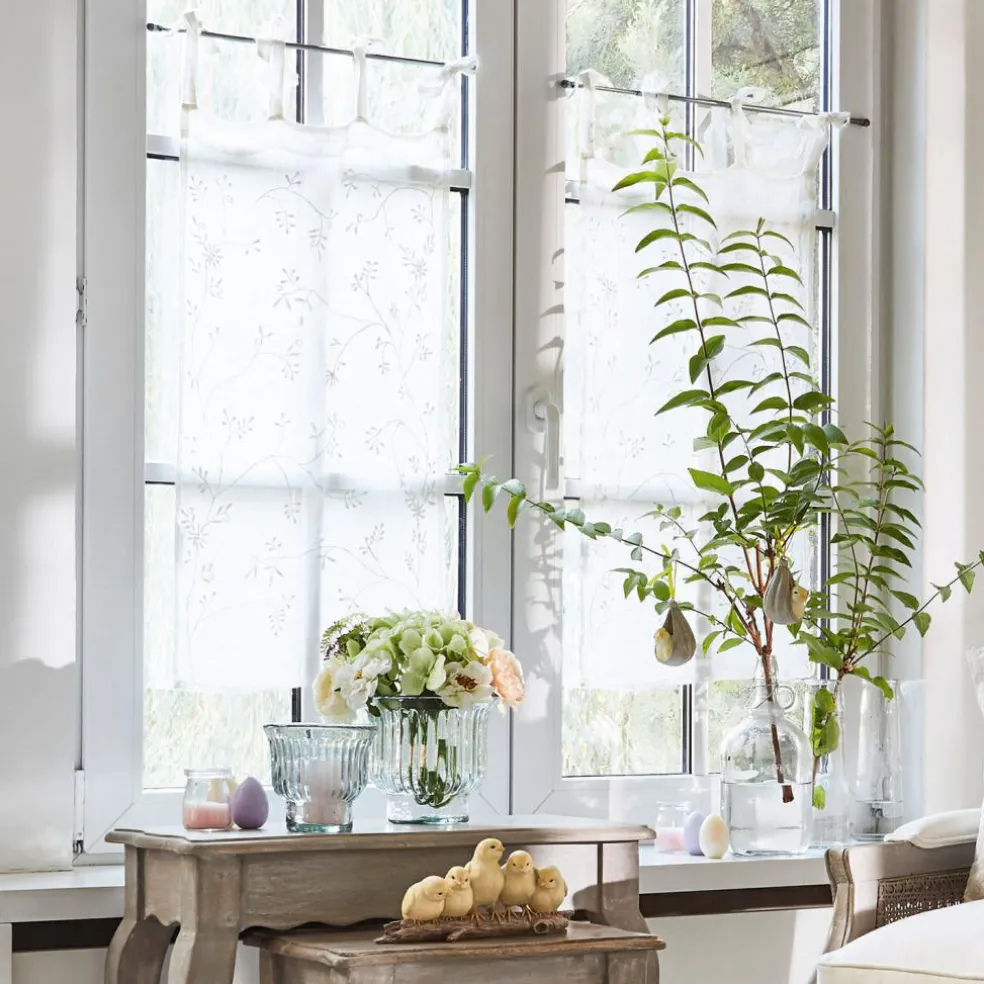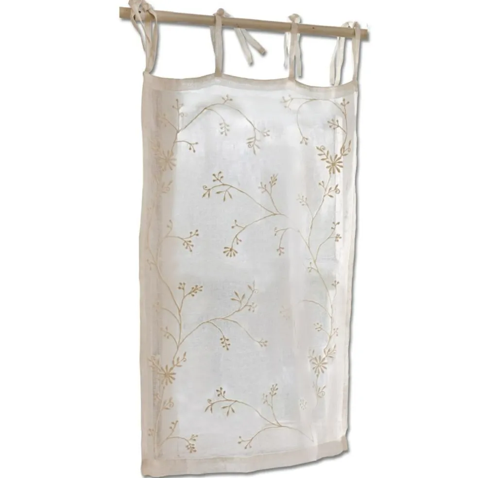 Die schmal geschnittene Scheibengardine aus reinem Leinen überzeugt mit einer floralen Ton-in-Ton-Stickerei sowie mit einer hochwertigen Verarbeitung. Der praktische Sichtschutz, der klassischerweise in der Küche zu finden ist, wird so zu einem charmanten Fensterschmuck, der jedem Zuhause eine Extraportion Gemütlichkeit und Individualität verleiht. Das Besondere: Die Bindebänder lassen sich ganz einfach um jede Gardinenstange binden und unterstreichen zudem den romantischen Look.