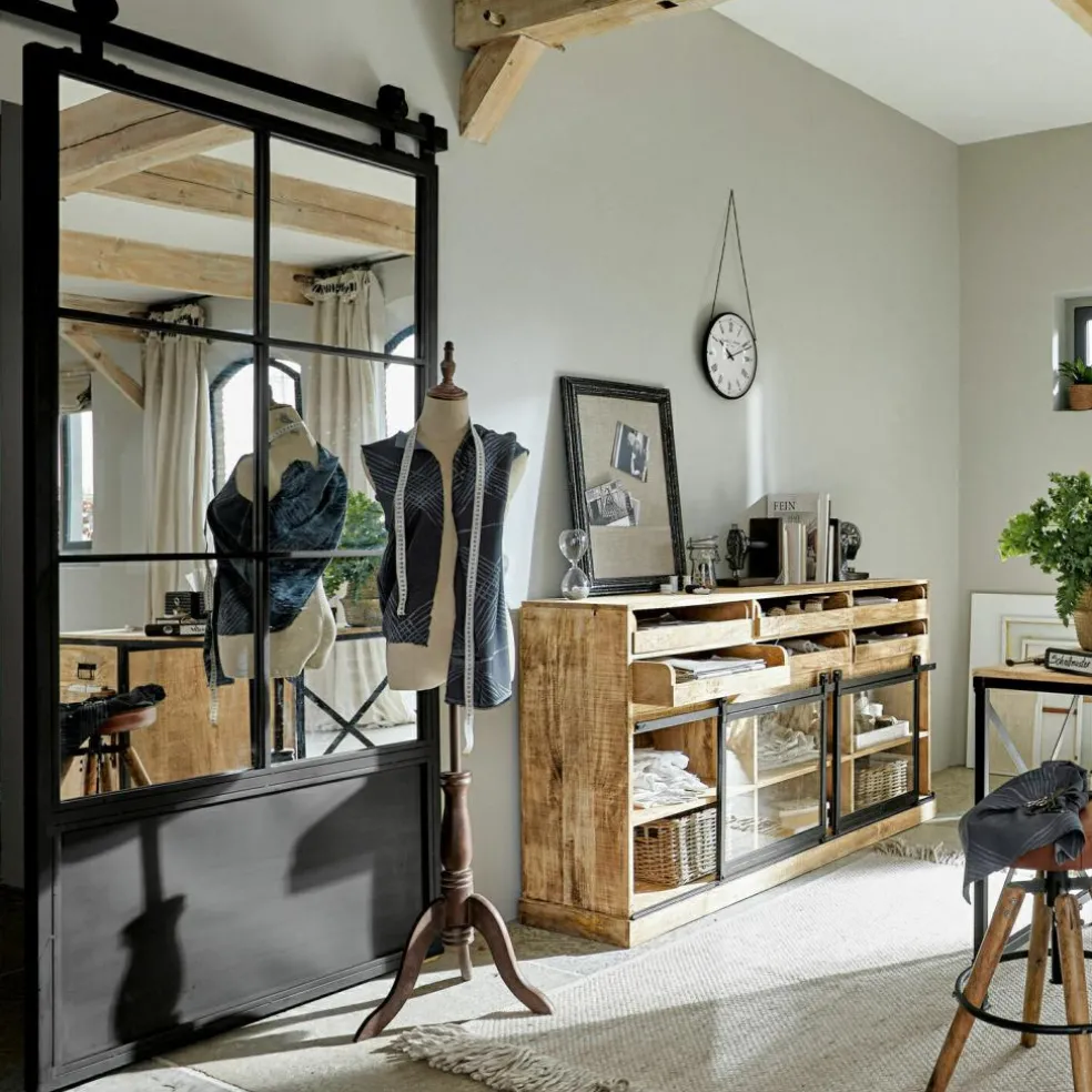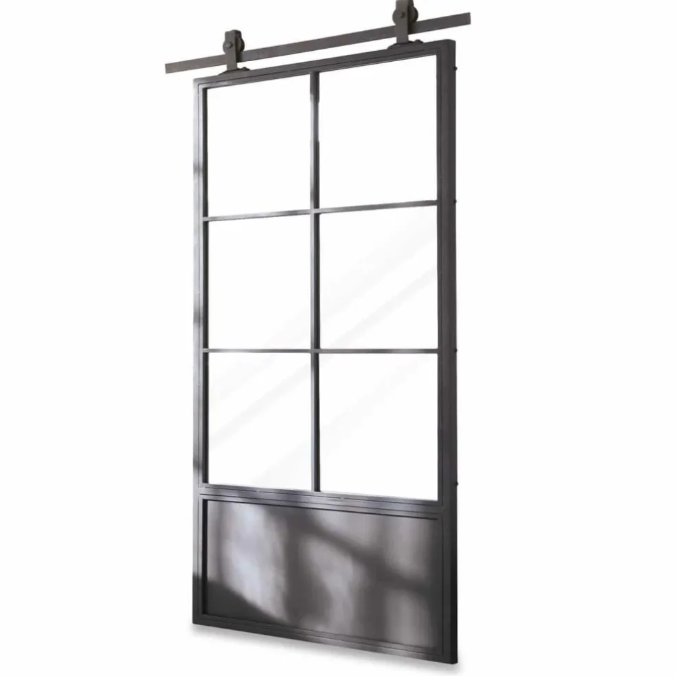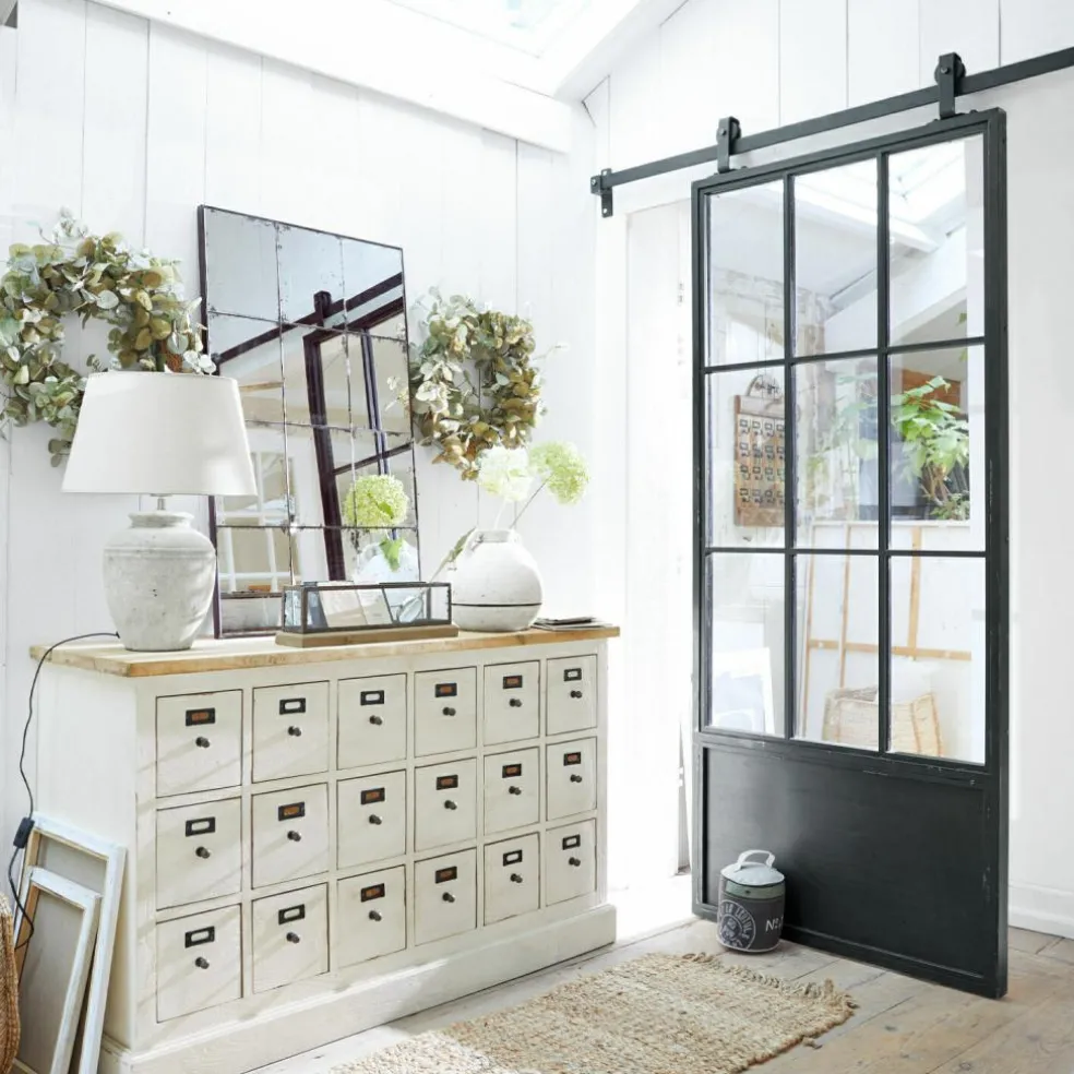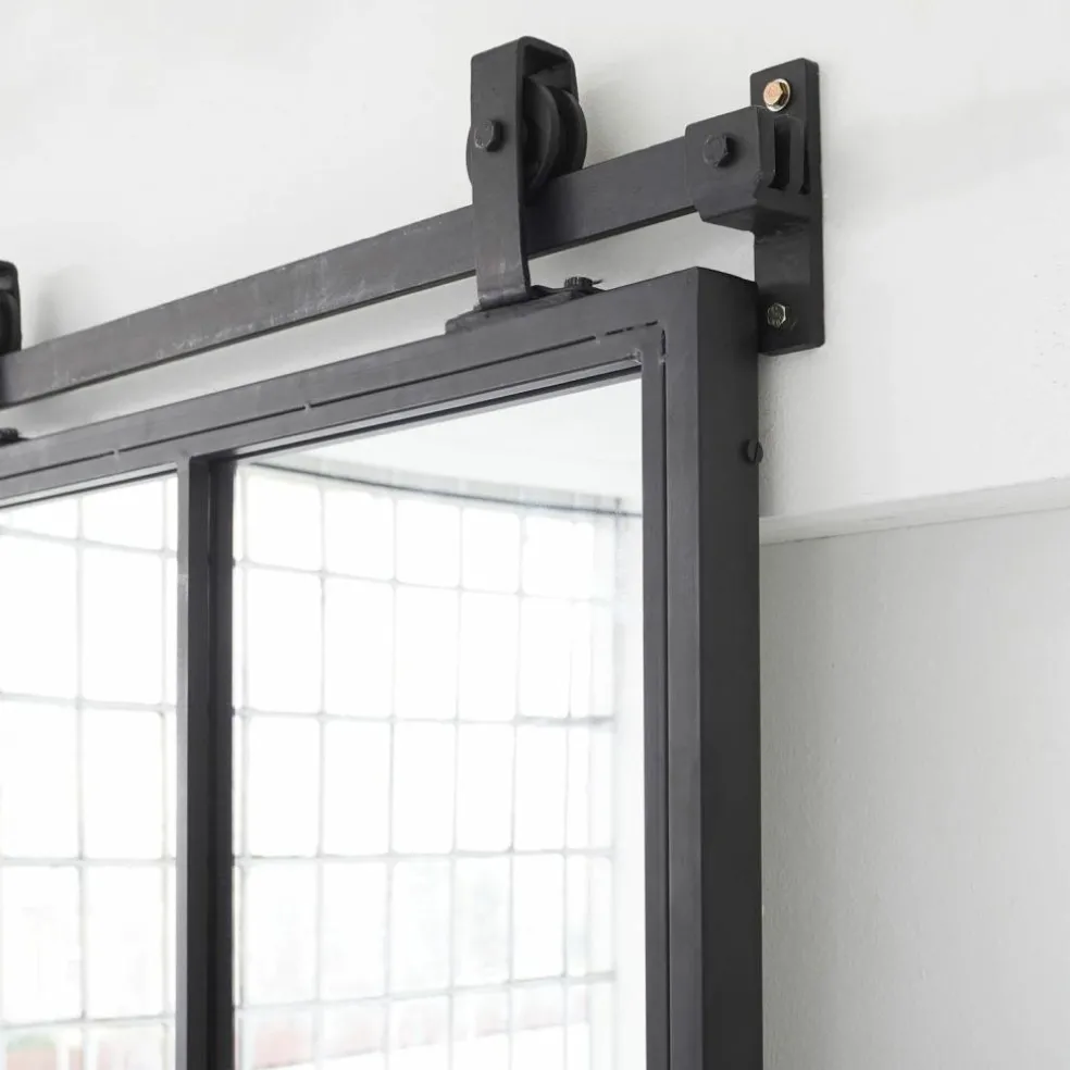 Sie fragen sich gerade, welchen Vorteil eine Schiebetür gegenüber einer normalen Zimmertür hat? Jede Menge. Es beginnt damit, dass eine Schiebetür absolut platzsparend ist, denn nie wird ein Türflügel störend in den Raum ragen. Ein Effekt, der gerade bei begrenztem Platzangebot von unschätzbarem Vorteil ist. Diese Tür ist außerdem mit einem großen Spiegelelement im traditionellen Sprossenfenster-Look ausgestattet, so dass Sie sich ganz bequem darin betrachten können. Was je nach Raumsituation noch interessanter ist: Der Spiegel wird immer Teile des Zimmers reflektieren und auf diese Weise auch kleinen Räumen Größe und Weite verleihen. Übrigens befindet sich der Spiegel auch auf der Rückseite der Tür. Das Faszinierendste an dieser Schiebetür ist aber das Design. Vom stabilen Rahmen über die klassischen Sprossenelemente am Spiegel bis zu der Aufhängevorrichtung ist sie komplett aus Eisen gefertigt, was ihre Nähe zum rustikalen Industrial-Style offenbart, was sie aber gleichzeitig wunderbar kompatibel mit modernen Landhaus-Interieurs macht, in denen Eisen traditionell einen festen Platz hat. Mit dieser Schiebetür können Sie im Schlafzimmer den Durchgang zum begehbaren Kleiderschrank oder zum Bad schließen. Sie eignet sich aber auch, um die Küche vom Essbereich abzutrennen. In jedem Fall wird die Schiebetür ein bewunderter Eyecatcher sein.