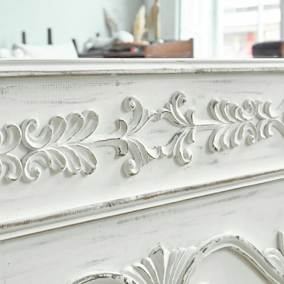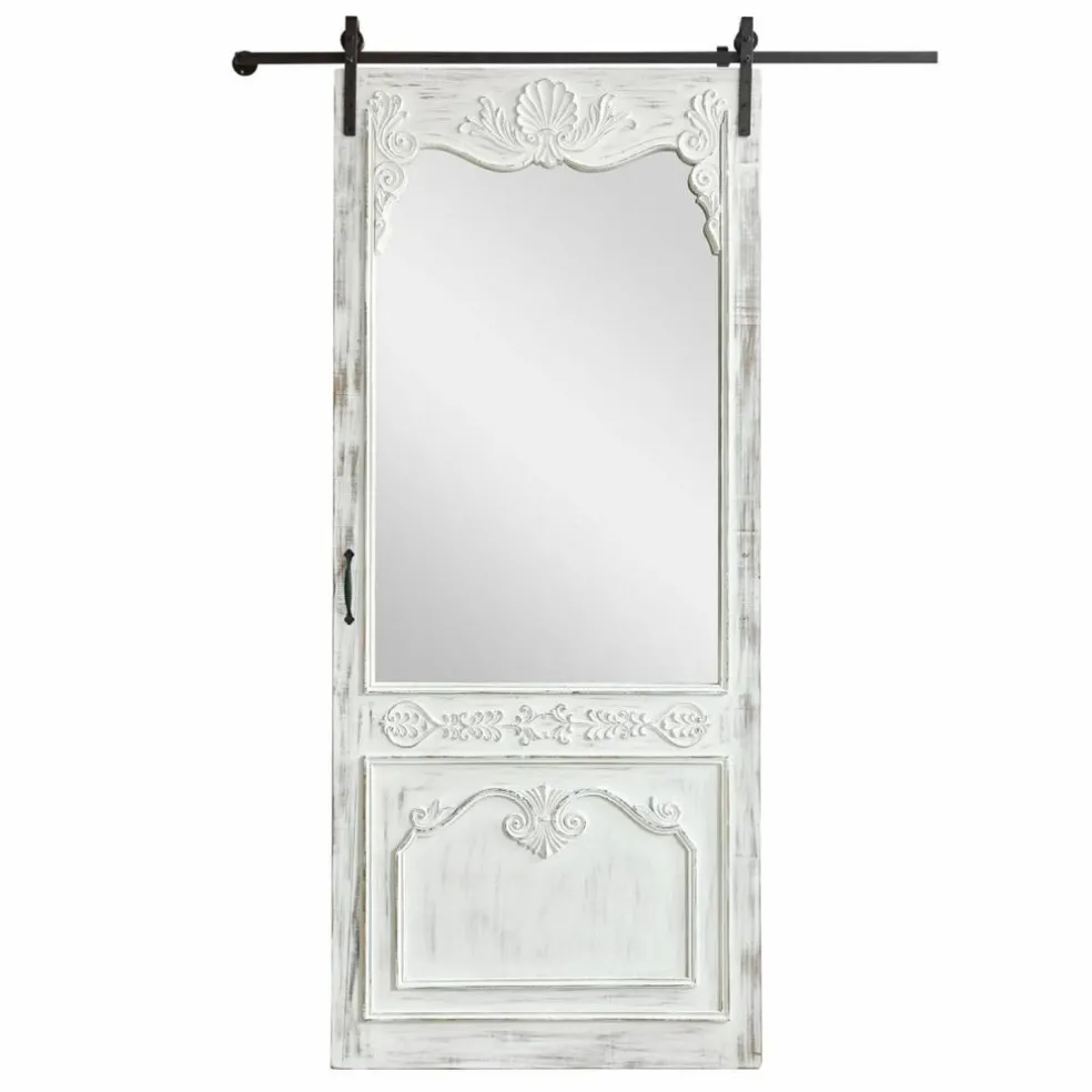 Diese Schiebetür kombiniert zeitlose Ästhetik mit moderner Funktion. Die liebevoll gearbeiteten Ornamente auf beiden Seiten der Tür ziehen alle Blicke auf sich und verleihen jedem Raum einen Hauch von Nostalgie. Das sorgfältig aufgetragene Antikweiß-Finish sorgt für eine faszinierende Optik, die sanfte Spuren der Zeit widerspiegelt. Der großflächige Spiegel ist nicht nur praktisch, sondern auch ein raffinierter Blickfang, der das Licht im Raum reflektiert und eine angenehme Tiefe erzeugt. Ob als Raumteiler oder Durchgangstür – diese Tür fügt sich mühelos in verschiedene Wohnkonzepte ein und bringt historische Eleganz in Ihr Zuhause.