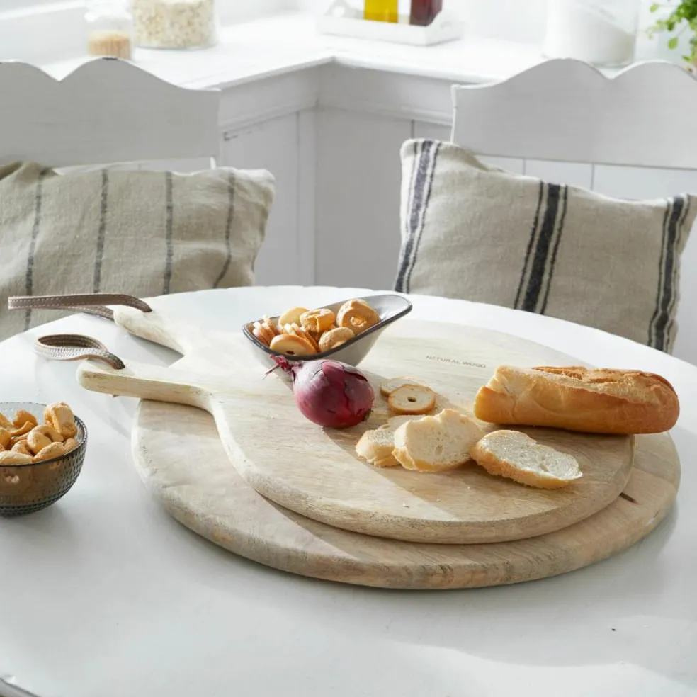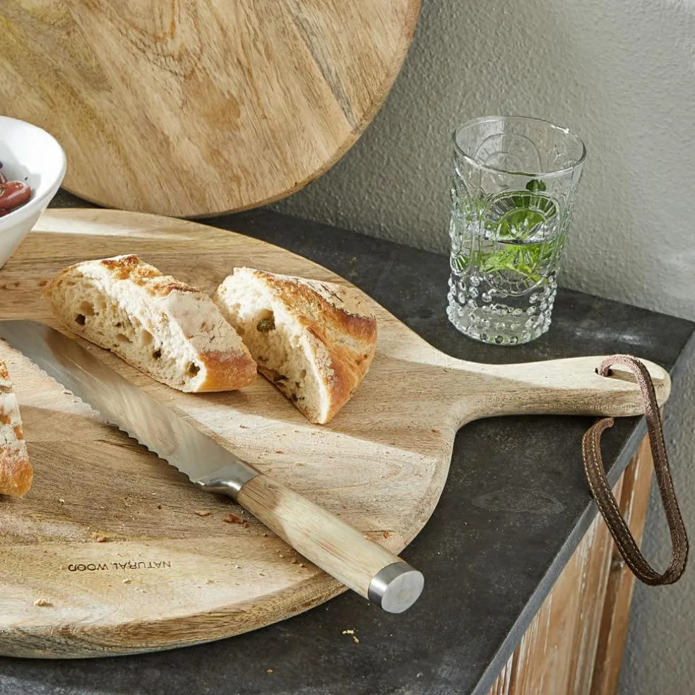Obst, Gemüse, Brot, Wurst, Fleisch, Zwiebeln, Kräuter – in einer Küche gibt es immer etwas zu schneiden, zu schnippeln, zu putzen und zu hacken. Neben Messern sind deshalb Schneidebretter die am häufigsten eingesetzten Küchenhelfer. Auch für Sie gehört der Griff zum Schneidebrett sicherlich zur täglichen Routine und wird ein besonderes Vergnügen werden, wenn Sie diese zwei Schneidebretter in Ihrer Küche parat haben. Sie sind aus naturbelassenem Mangoholz gefertigt, das als Nebenprodukt des Obstanbaus umweltfreundlich und nachhaltig ist. Außerdem gehört Mangoholz zu den wertvollen Harthölzern, die ordentlich was wegstecken können und durch den jahrelangen Gebrauch in der Küche eher an Charakter gewinnen. Doch das Schneidebrett wird sich nicht nur als praktischer Küchenhelfer bei Ihnen beliebt machen, dank seiner schönen Maserung, die von dem Antik-Finish wirkungsvoll betont wird, eignet es sich auch hervorragend als Präsentationsfläche für Aufschnitt, als Käseplatte und für Brot, aber auch zum Anbieten von Fingerfood, Tapas und anderen kulinarischen Köstlichkeiten, mit denen Sie gerne Ihre Gäste verwöhnen. Nach Gebrauch reinigen Sie das Schneidebrett einfach mit etwas Seifenwasser, lehnen es an die Küchenwand oder hängen es mit dem Büffellederriemen an die Wand.