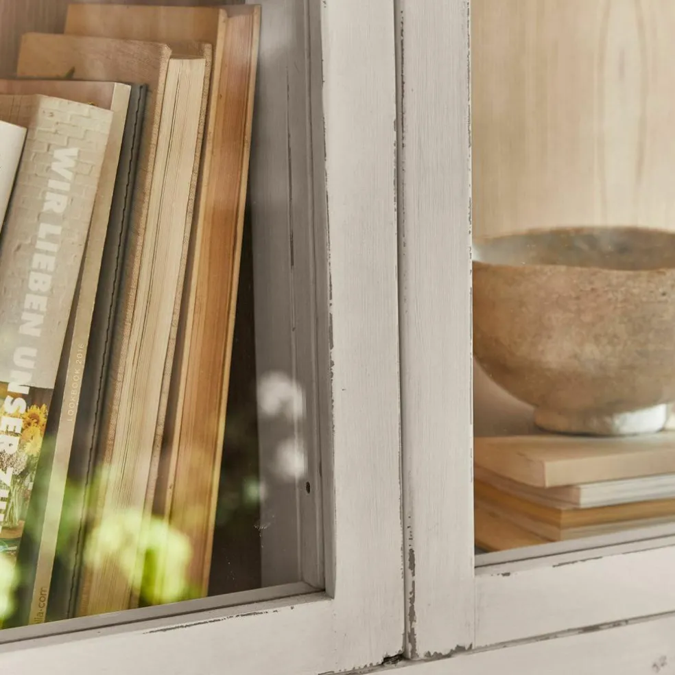 Dieser Vitrinenschrank zeigt sich offen, denn die elegante Glasfläche gewährt Einblicke in das Schrankinnere. Die hübschen Sprossenfenster werden durch Glas komplettiert. Der Schrank ist ein geradliniges Upcycling-Möbelstück und aus wiederaufbereitetem Tannenholz. Dieses ist naturbelassen, so kommt die Schönheit des Holzes unverfäscht zur Geltung. Mit sechs Türen und vier Einlegeböden verfügt er über viel Platz. Neben der großzügigen Staufläche begeistert der Vitrinenschrank als Showbühne für Ihre Bücher, Weingläser, Porzellan oder Wohnaccessoires. Und der ganz große Auftritt ist ihnen damit garantiert sicher. Praktisch: Durch die geschlossene Bauweise hat der Staub keine Chance. Im Schrankinneren sind Ihre Lieblingsstücke gut verwahrt und Sie haben trotzdem alles im Blick.