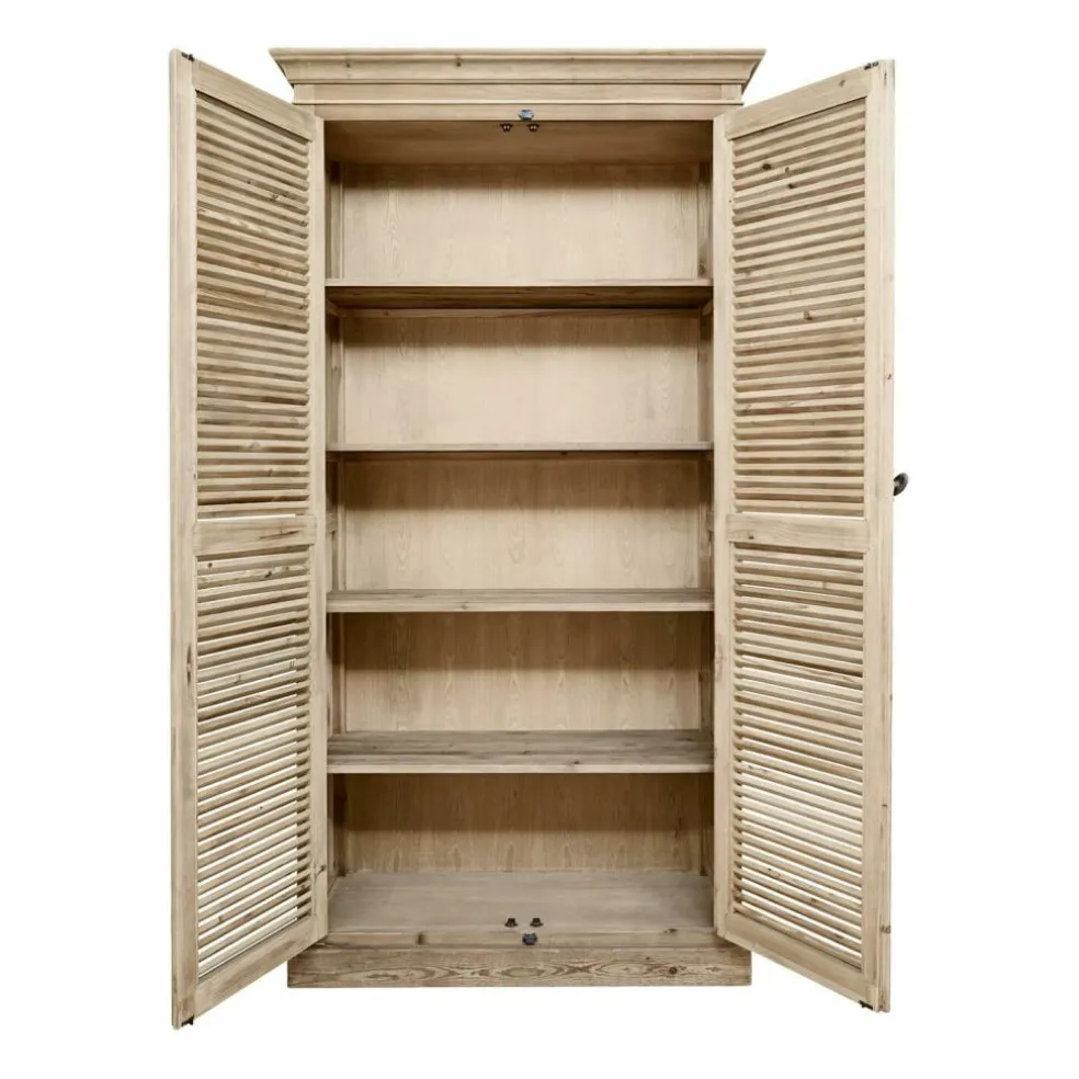 Mit diesem wunderschönen Exemplar hält das Gefühl eines Sommers in Südfrankreich Einzug in Ihrem Zuhause. Das Design verbreitet diese magische Atmosphäre eines französischen Landhauses – es fehlen nur die duftenden Lavendelfelder vor der Türe. Aber diese kann man sich ja einfach in Gedanken herbeizaubern. Hinter den liebevoll gestalteten Türen verbirgt sich viel Stauraum. Dank der vier Einlegeböden können Textilien, Bücher oder andere Utensilien schön ordentlich aufbewahrt werden. Der größtenteils aus wiederaufbereitetem Tannenholz hergestellte Lamellenschrank überzeugt optisch und qualitativ gleichermaßen. Perfekt für Liebhaber von klassischem Interior oder Leben im Landhaus-Stil.