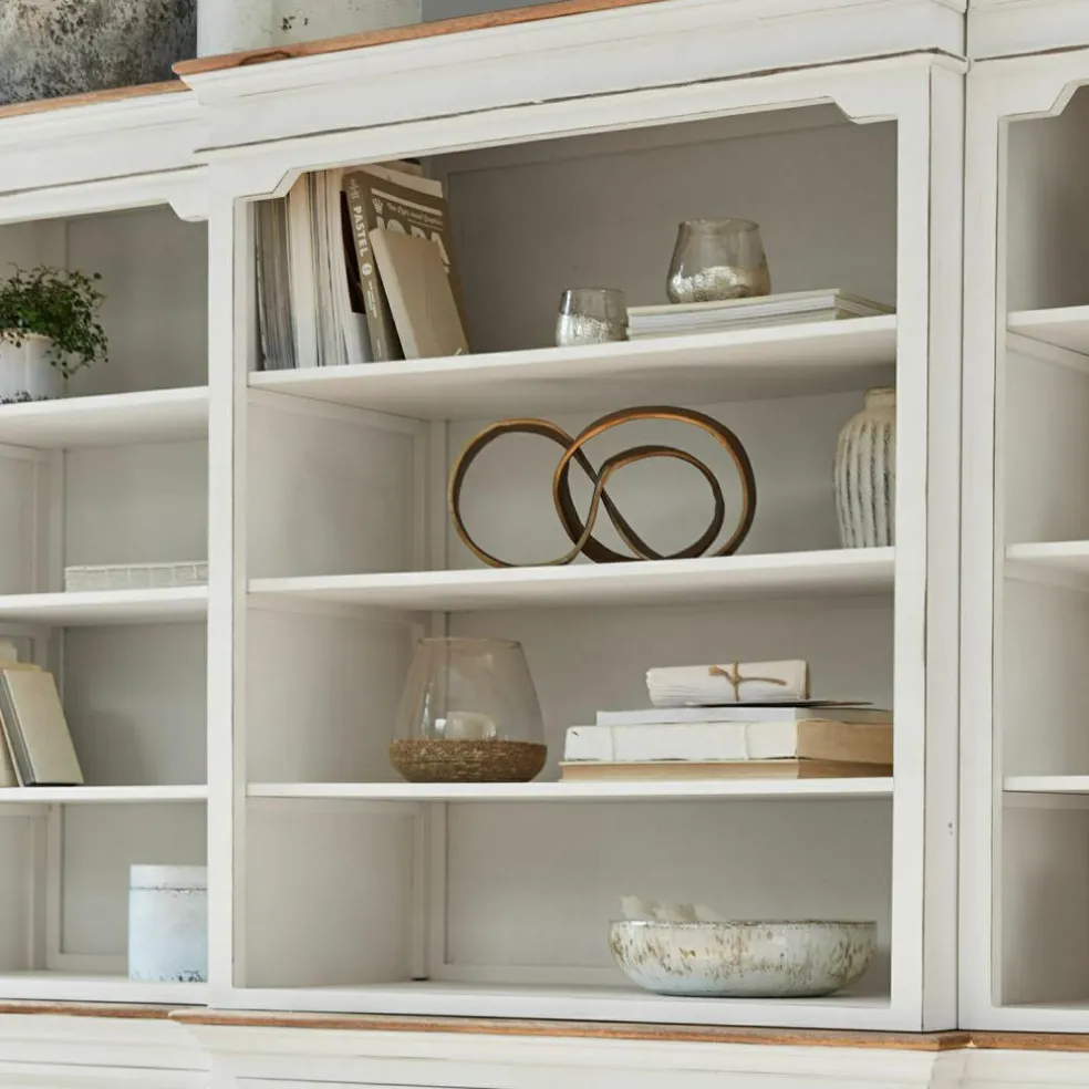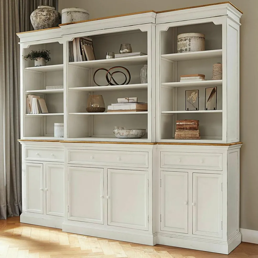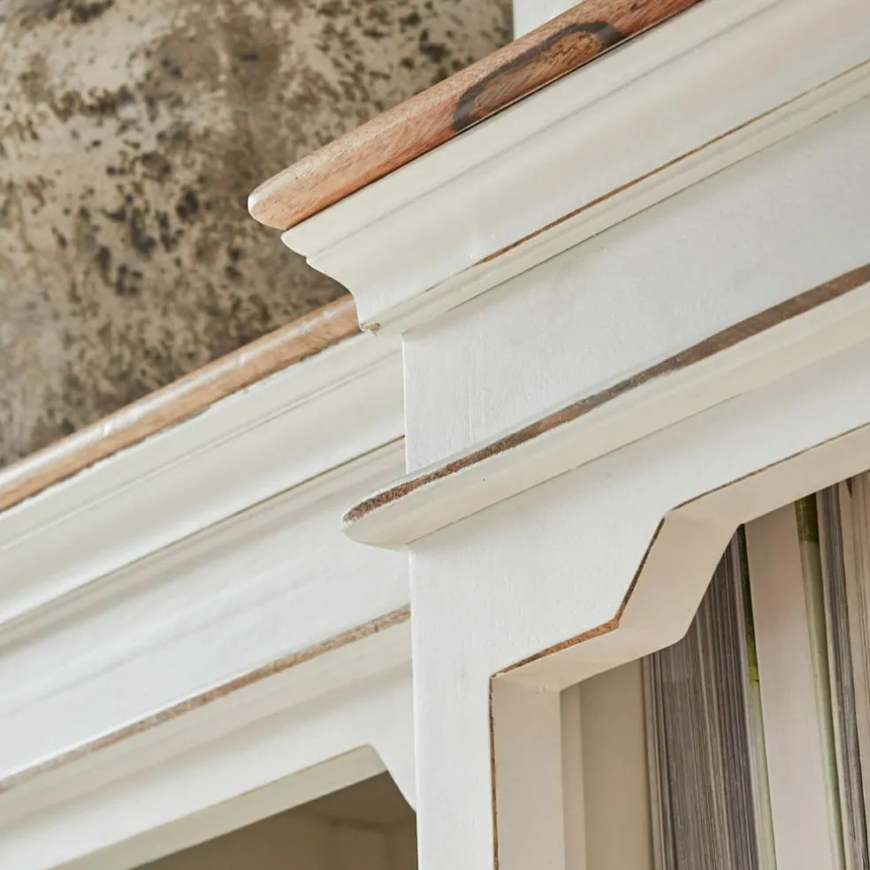 Dieser Schrank ist ein wahres Meisterstück des Landhausstils und verbindet Funktionalität mit ästhetischem Anspruch. Das Mangoholz mit Antik-Finish verleiht jedem Raum eine natürliche Wärme und macht das Möbelstück zu einem zeitlosen Blickfang. Besonders hervorzuheben ist die mittige Zierleiste aus naturbelassenem Holz, die das Design harmonisch abrundet. Der großzügige Aufbau mit offenen Regalen und praktischen Schränken sorgt für optimalen Stauraum – sei es für edles Porzellan, inspirierende Literatur oder Ihre liebste Dekoration. Die dezenten Holzknöpfe fügen sich perfekt in das Gesamtbild ein und unterstreichen die Authentizität dieses vielseitigen Möbelstücks.
