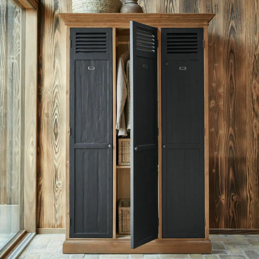 Ein wahrer Blickfang für jedes Zuhause: Dieser Schrank besticht durch sein massives Holz und die harmonische Kombination aus schwarzem Finish und natürlichem Holzton. Die drei markanten Türen sind mit Lüftungsgittern und praktischen Etikett-Einschüben ausgestattet, die an den klassischen Spint-Look erinnern, jedoch mit der warmen Haptik von Holz überraschen. Das Innere des Schranks bietet maximale Flexibilität dank herausnehmbarer Stangen und Böden, sodass Sie den Stauraum ganz nach Ihren Bedürfnissen gestalten können. Ob als Garderobenschrank im Flur oder als vielseitiger Stauraum im Wohnbereich, dieser Schrank vereint funktionales Design mit hochwertiger Handwerkskunst.