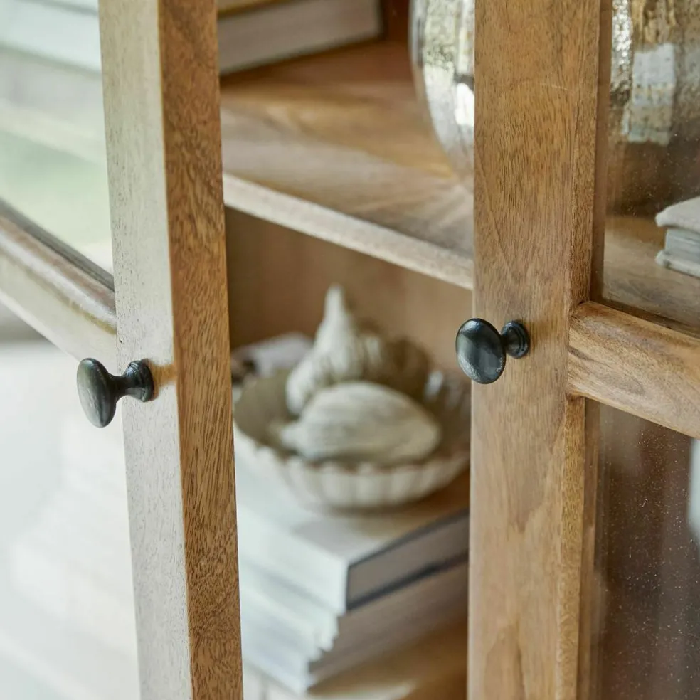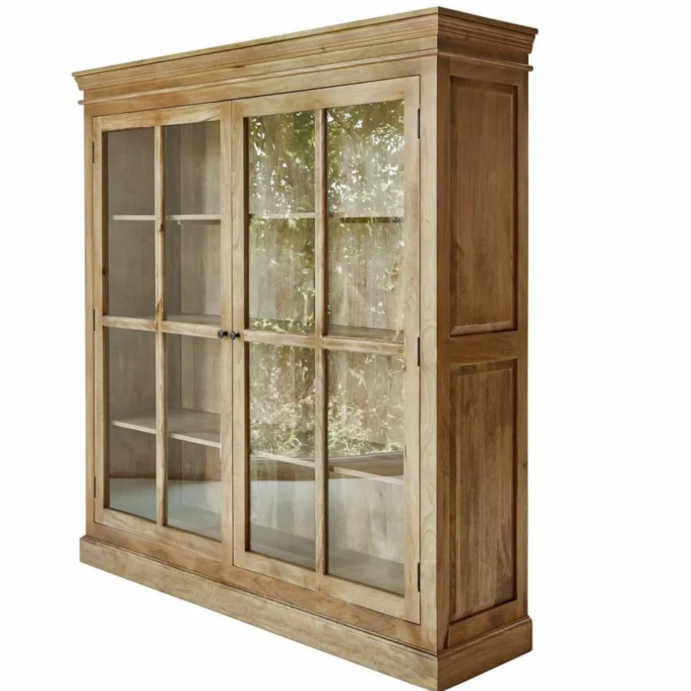 Dieser elegante Schrank aus hochwertigem Mangoholz bringt die natürliche Schönheit des Holzes durch ein leichtes Antikbraun-Finish perfekt zur Geltung. Die charakteristische Holzmaserung sorgt für einen warmen, einladenden Look, während die Sprossenfenster-Optik der Glastüren einen rustikalen Charme verleiht. Hinter den großzügigen Glastüren finden sich gut strukturierte Fächer, die reichlich Platz für Bücher, Geschirr oder dekorative Elemente bieten. Das massive Mangoholz mit seiner schönen Holzmaserung und die klaren Linien verbinden traditionelle Handwerkskunst mit moderner Eleganz. Ob als Vitrine oder als Schrank für die Präsentation und Aufbewahrung Ihrer wertvollsten Gegenstände, dieses Möbelstück wird zum stilvollen Blickfang in jedem Wohnbereich.