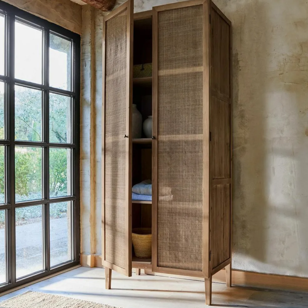 Edler Stil trifft Nachhaltigkeit: Ob im Wohnraum für Decken und Bastelmaterialien oder im Arbeitszimmer für Bücher und Papiere – wie Ihre Entscheidung auch ausfällt, Ihre Lieblingsstücke sind in diesem kunstvoll gefertigten Schrank ordentlich verstaut. Dieses schöne Möbelstück ist aus massivem, wiederaufbereitetem Tannenholz, das sich in seiner natürlichen, nachhaltigen Schönheit zeigt. Die Türen aus Rattengeflecht verstärken den Eindruck und lassen erahnende Einblicke ins Innere zu. Hinter ihnen ist alles gut vor Staub geschützt und doch immer zur Hand, wenn es benötigt wird – ob Haushaltsgeräte, Geschirr, Bücher oder Accessoires aller Art.