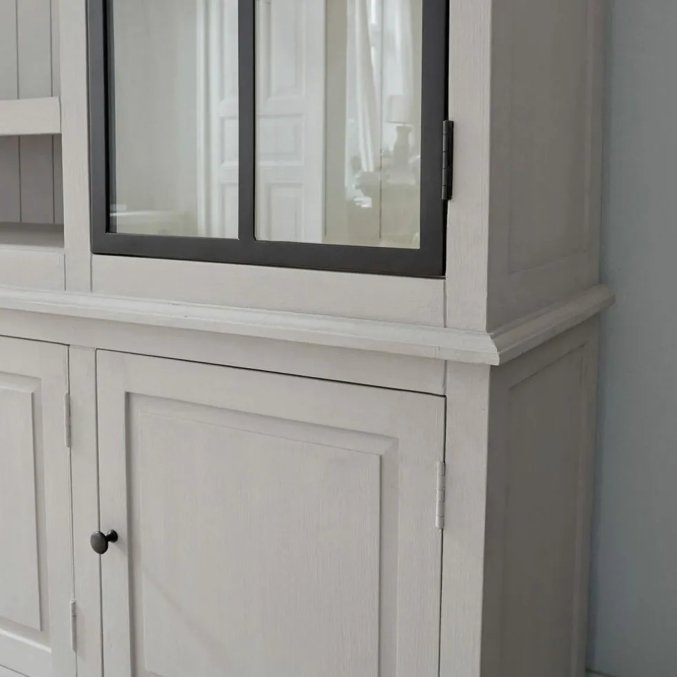 Das TV-Gerät und die Musikanlage, Bücher, CDs, Spiele, geliebte Erinnerungsstücke – im Laufe der Zeit sammelt sich in einem Haushalt eine Unmenge an Dingen an. Manche braucht man täglich, andere wieder selten und doch mag man sich nicht von Ihnen trennen. Wie schön, wenn man dann einen Aufbewahrungsort hat, der praktische Funktionalität mit Qualität und Design vollendet zu verbinden weiß! Dieser Schrank bietet Ihnen mit seinen stattlichen Maßen viel Platz für alles, was Sie im Wohnraum jeden Tag brauchen oder gerne jederzeit griffbereit hätten. Das fängt beim TV-Gerät und bei der Musikanlage an, die sich problemlos in den Schrank integrieren lassen, denn in der Rückwand sind bereits Aussparungen für die Kabel zum Anschluss der Geräte vorgesehen. Das hört bei den vielen anderen Dingen noch lange nicht auf, die Sie in den Fächern mit den Glastüren stilvoll präsentieren oder hinter den geschlossenen Schranktüten unsichtbar verstauen können. Und bei all diesen praktischen Vorzügen gelingt es dem Schrank zugleich, das optische Highlight im Wohnraum zu sein. Dazu tragen die klassischen Holztüren mit den Landhaus-typischen Verzierungen bei ebenso wie die hochwertige Lammellenrückwand und der aufwendig gearbeitete Kranzabschluss. Einen aparten Kontrast dazu bilden aber die Glastüren, deren Sprossen aus Eisen gefertigt sind und einen Hauch Industrial-Flair verbreiten. Ein Schrank, der den individuellen Charakter Ihres Zuhauses perfekt unterstreicht.