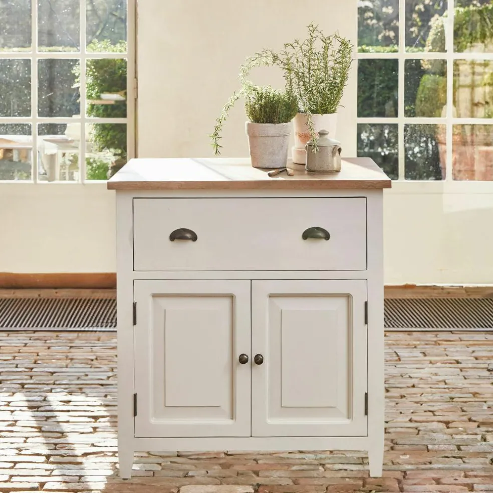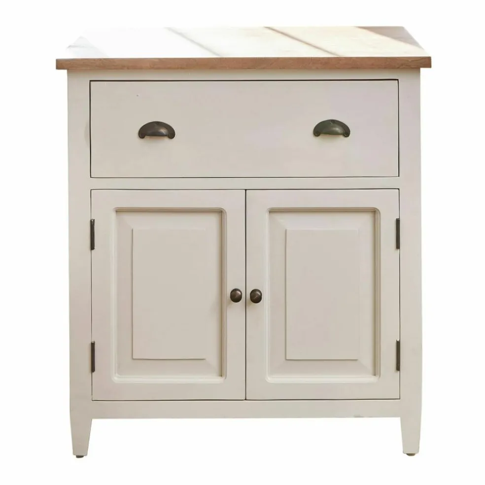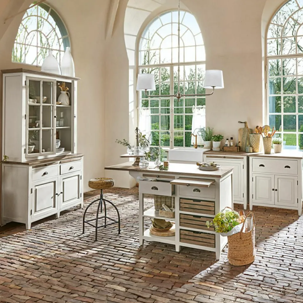 Mit der Hand über die massive, naturbelassene Arbeitsplatte streichen und die ausdrucksstarke Maserung des Mangoholzes bewundern, mit den Fingerspitzen in die hübschen Muschelgriffe greifen, um die große Schublade zu öffnen – Handgriffe, die Sie bestimmt immer wieder gerne machen werden, wenn dieser charmante Schrank erst in Ihrer Küche steht. Hinter seinem zweifarbigen Äußeren, das frisches Landhaus-Flair versprüht, verbirgt sich jede Menge Stauraum, den Sie ganz nach Ihren Wünschen für Geschirr, Besteck, Schüsseln und Co nutzen können. In bester Handwerksmanier aus edlem Mangoholz geschreinert wird Ihnen der Schrank Jahr für Jahr gerne zu Diensten sein. Er eignet sich ideal, um in Kombination mit den anderen Küchenmodulen – Spülenschrank (23193), Schrank (23195) oder Küchenblock (23194) – zu Ihrer individuell gestalteten Küchenzeile zu verschmelzen. Wenn Sie es wünschen, wird der Schrank sich aber auch gerne in einem anderen Raum als Kommode mit moderner Landhaus-Ausstrahlung für Sie nützlich machen.