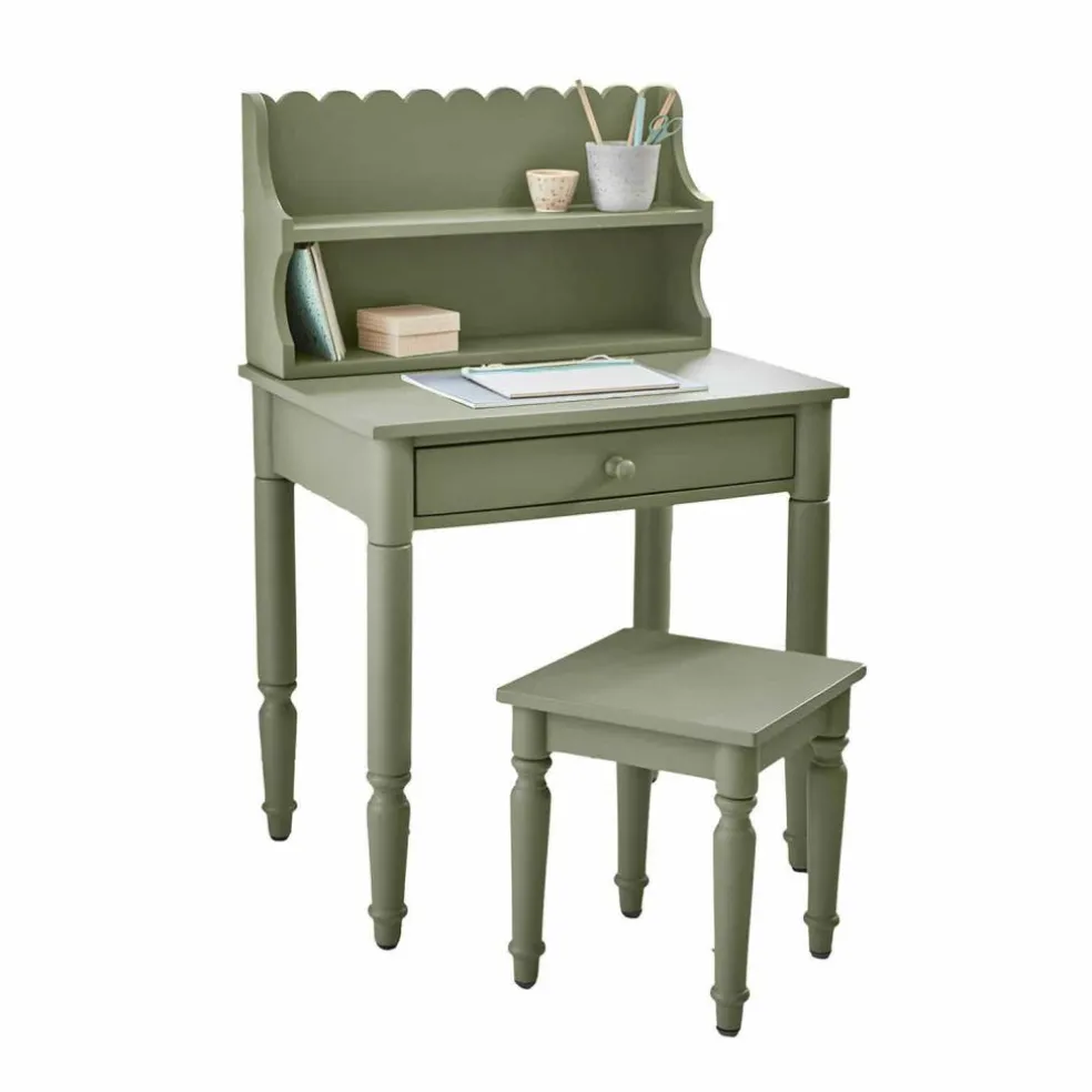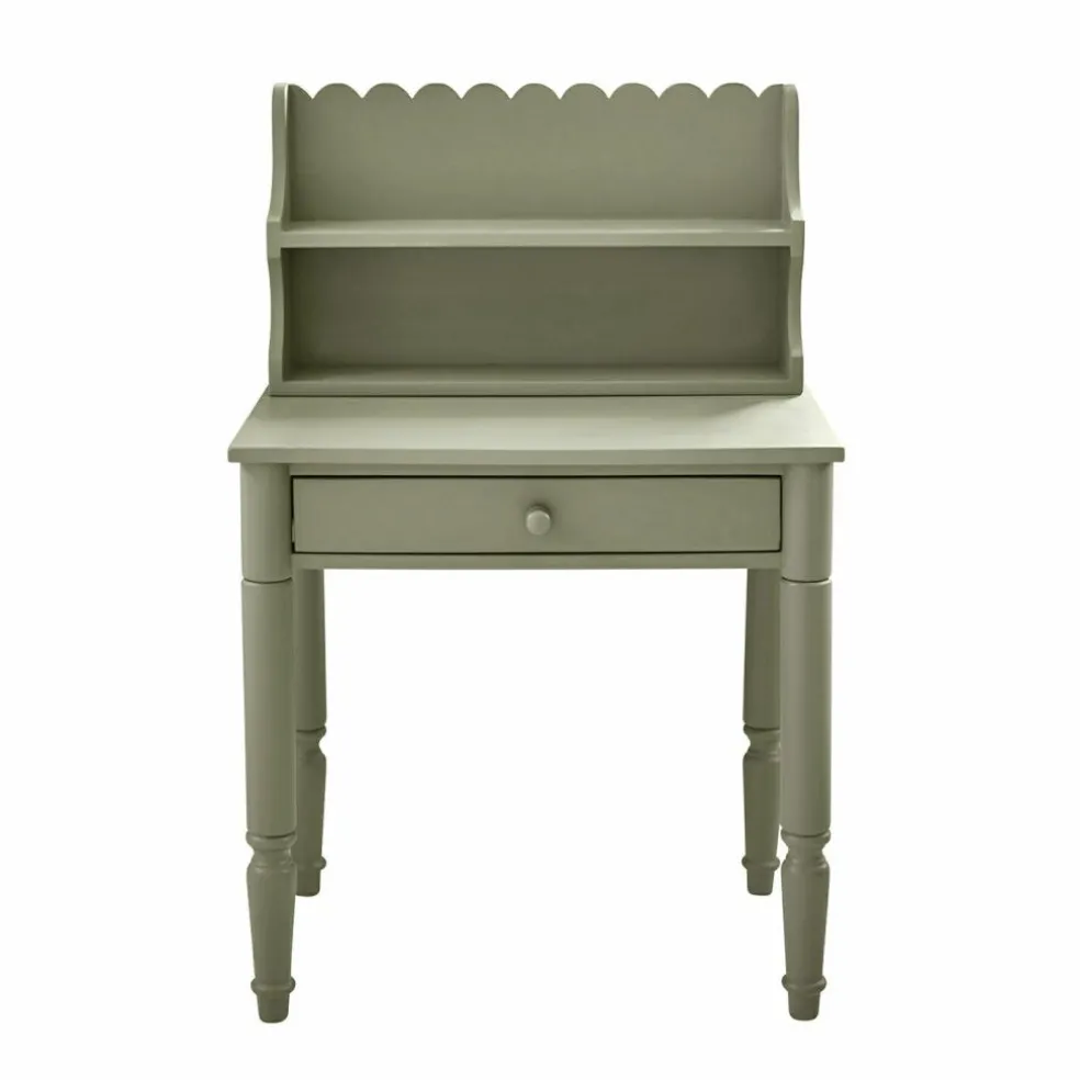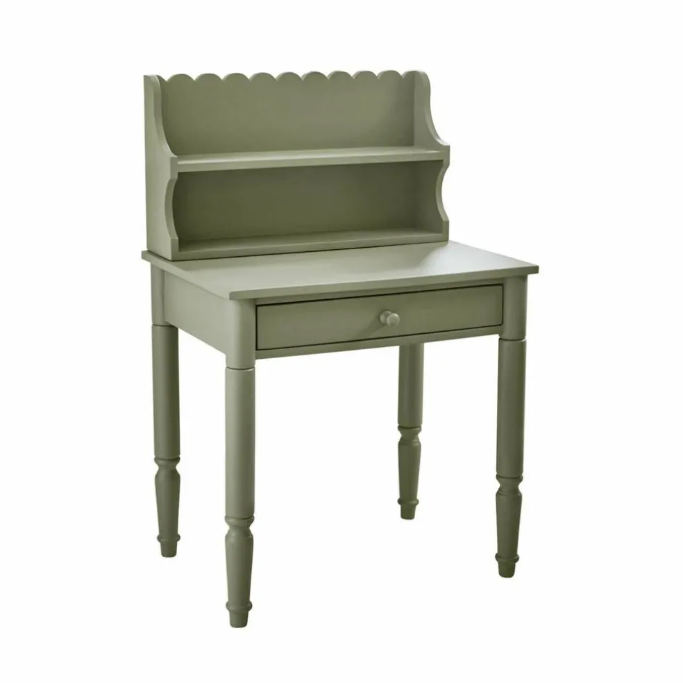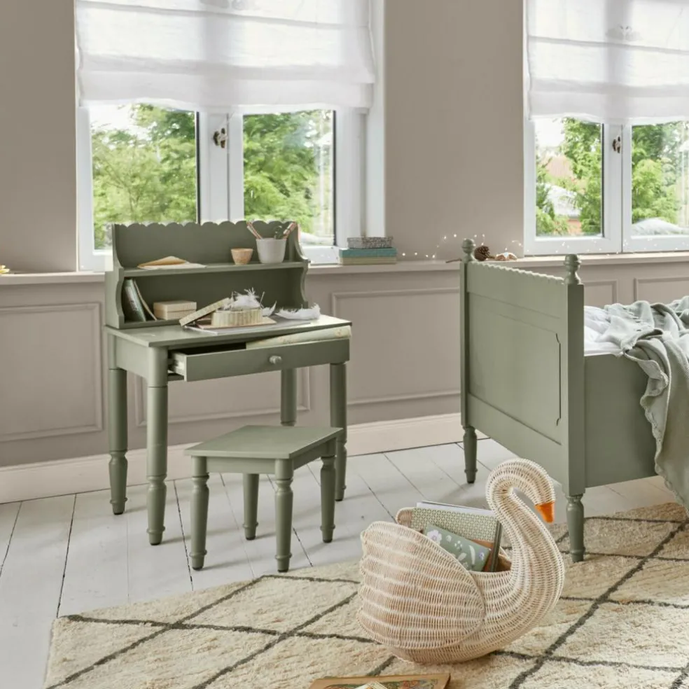 Wenn Lernen zum Lieblingsmoment wird, steckt oft ein besonders schöner Platz dahinter – wie dieser zarte Kinderschreibtisch in grünlicher Lackierung. Die weiche Farbgebung wirkt beruhigend und fügt sich harmonisch in jedes Kinderzimmer ein. Mit liebevollen Details wie der geschwungenen Wellenkante am Aufsatz, gedrechselten Beinen und einem kleinen Holzknauf an der Schublade erzählt dieses Möbelstück von Geborgenheit und Kreativität. Zwei offene Fächer laden dazu ein, Stifte und Lieblingssachen hübsch zu ordnen, während in der Schublade kleine Schätze verschwinden dürfen. Ein idealer Begleiter für erste Schreibversuche, Hausaufgaben oder fantasievolle Bastelstunden.