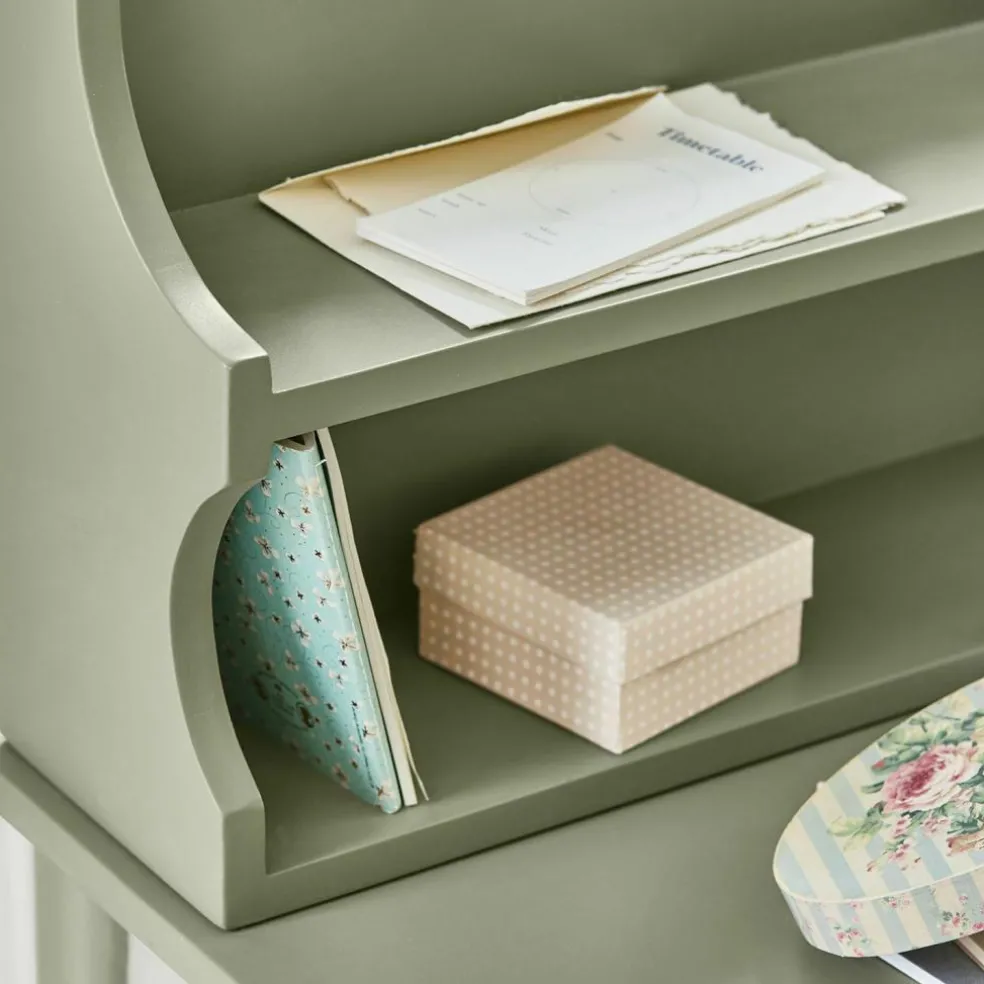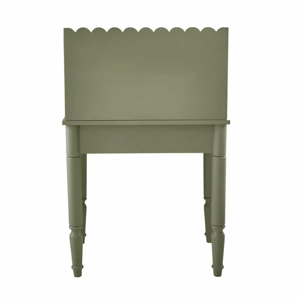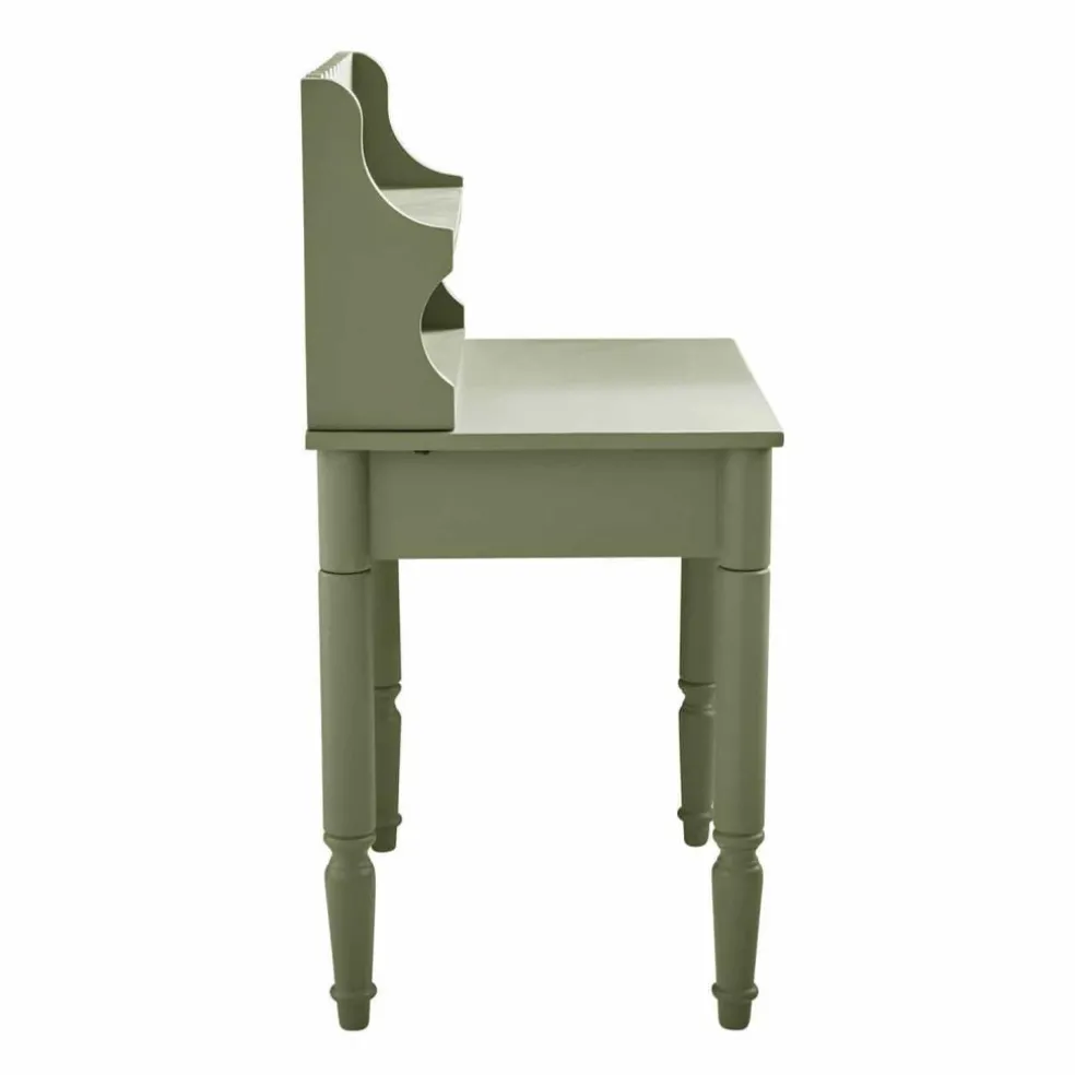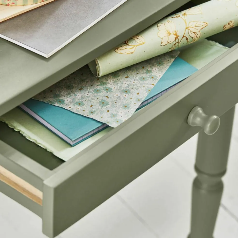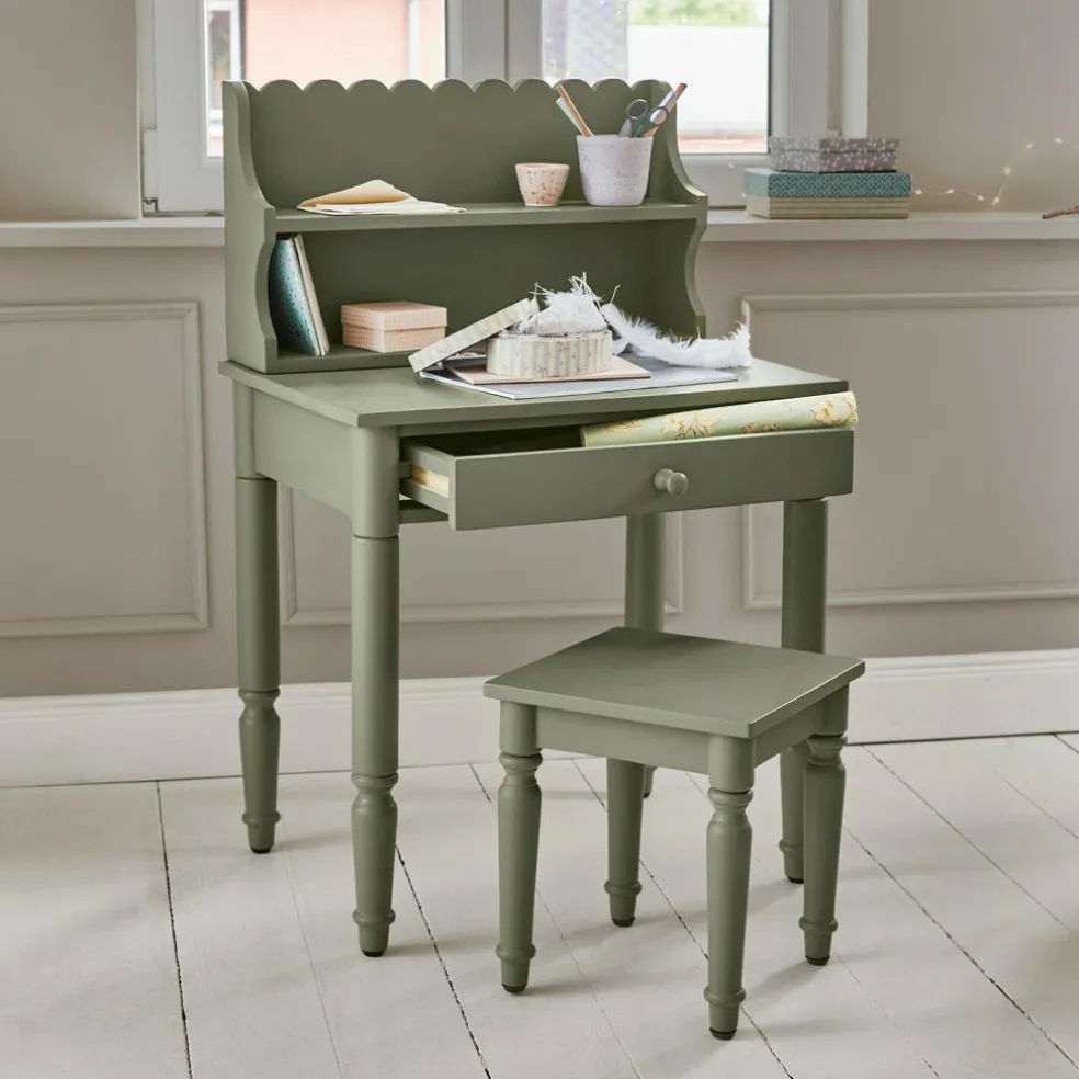 Wenn Lernen zum Lieblingsmoment wird, steckt oft ein besonders schöner Platz dahinter – wie dieser zarte Kinderschreibtisch in grünlicher Lackierung. Die weiche Farbgebung wirkt beruhigend und fügt sich harmonisch in jedes Kinderzimmer ein. Mit liebevollen Details wie der geschwungenen Wellenkante am Aufsatz, gedrechselten Beinen und einem kleinen Holzknauf an der Schublade erzählt dieses Möbelstück von Geborgenheit und Kreativität. Zwei offene Fächer laden dazu ein, Stifte und Lieblingssachen hübsch zu ordnen, während in der Schublade kleine Schätze verschwinden dürfen. Ein idealer Begleiter für erste Schreibversuche, Hausaufgaben oder fantasievolle Bastelstunden.