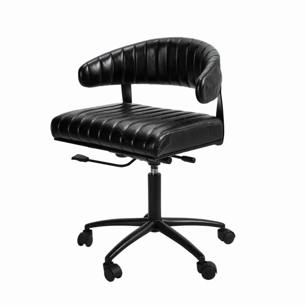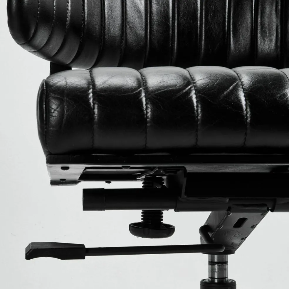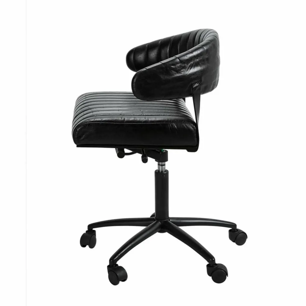 In diesem Drehstuhl vereint sich Funktionalität mit souveränem Stil. Der Bezug aus echtem Leder wirkt nicht nur edel, sondern ist auch angenehm griffig und langlebig. Die markante Quersteppung unterstreicht den klassischen Charakter, während die geschwungene Rückenlehne und gepolsterten Armstützen sanft umfangen. Dank der wippenden Mechanik und der höhenverstellbaren Sitzfläche passt sich der Stuhl mühelos individuellen Bedürfnissen an – ob am Schreibtisch, im Atelier oder Homeoffice. Die solide Metallbasis auf Rollen sorgt für Mobilität und Stabilität zugleich. Für alle, die Komfort nicht dem Zufall überlassen wollen.