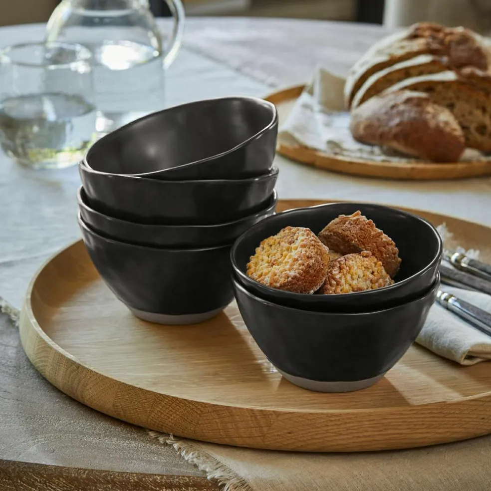 Eine Extraportion Stil bitte – dieses schicke 6er Set bezaubert mit einem individuellen Design. Es hat mediterranen Charme. Die sechs Schüsseln haben einen reizenden, handgetöpfert wirkenden Charakter. So werden kleine, bewusste Unebenheiten zum interessanten Detail. Das Set mit persönlicher Note besteht aus glänzend glasiertem Steinzeug mit einem dekorativen, dunklen Rand und einem unglasierten Boden. Die schönen Schalen lassen sich sehr vielseitig einsetzen – natürlich für feine Leckereien wie Eis, Joghurt, Früchte oder süße Desserts. Doch auch Suppen und kleine Salate schmecken hieraus gleich noch besser. So sind sie von morgens bis abends ein perfekter Begleiter für Ihren stilvoll gedeckten Tisch. Wer mag, kann sie auch mit Dekorativem befüllen. Zu vorhandenem Geschirr oder als Ergänzung zum passenden Set, hiermit beweisen Sie jederzeit guten Geschmack.