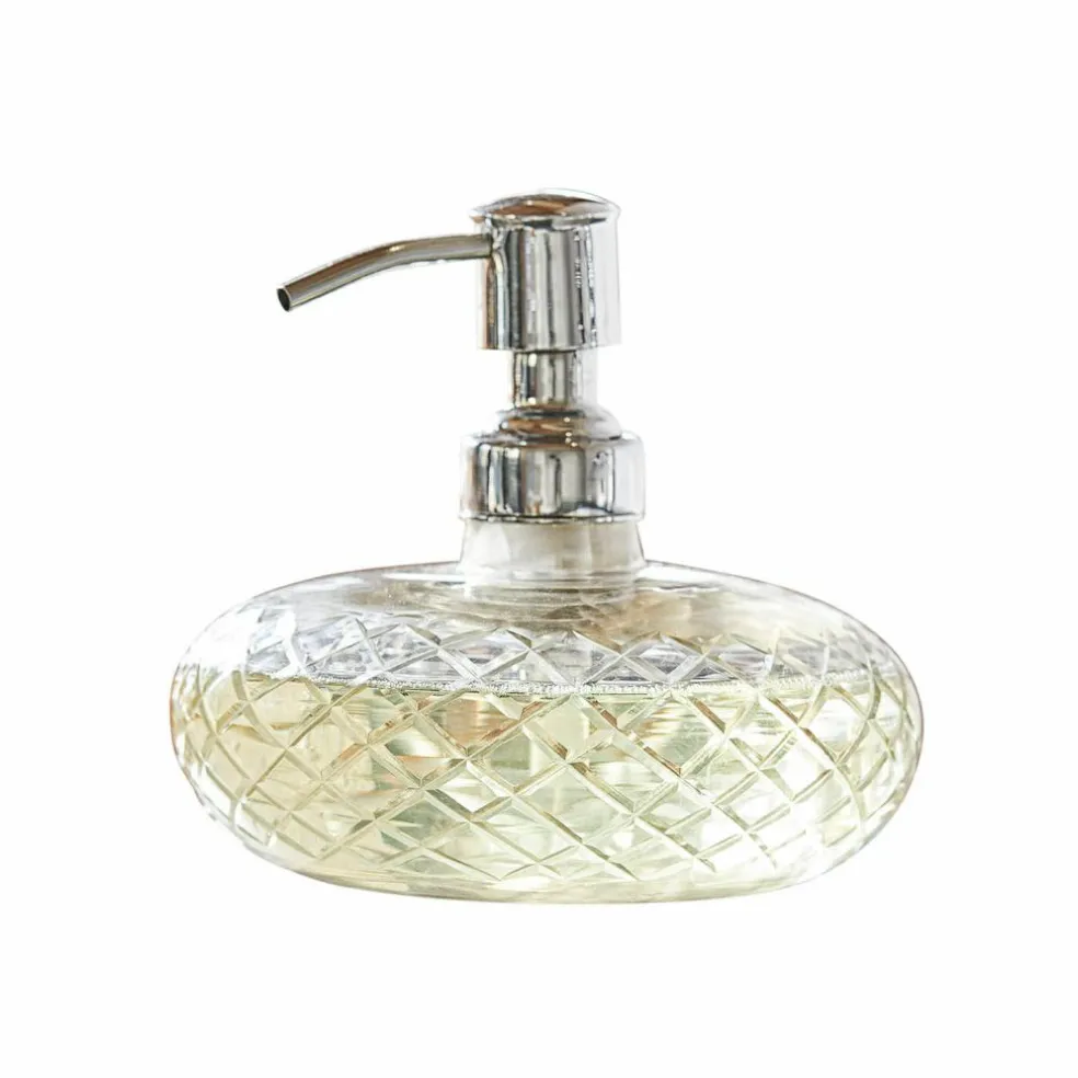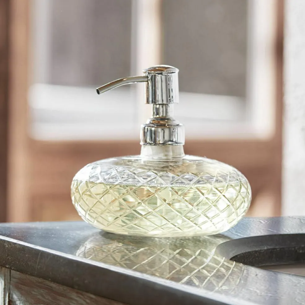 Äußerst praktisch und schön zugleich: Mit diesem Seifenspender wird das Händewaschen zum Vergnügen. So machen Sie Ihre tägliche Routine zu einem luxuriösen Erlebnis. Der Korpus besteht aus geschliffenem Glas und ist mit einem eleganten Rautenmuster verziert, während der Pumpmechanismus aus Messing gefertigt ist. Im Gegensatz zu herkömmlichen Plastikseifenspendern bietet dieses stilvolle Schmuckstück nicht nur ein edles Erscheinungsbild, sondern ist auch umweltschonend, da es die Verwendung von Nachfüllpackungen ermöglicht. Rundum schön!