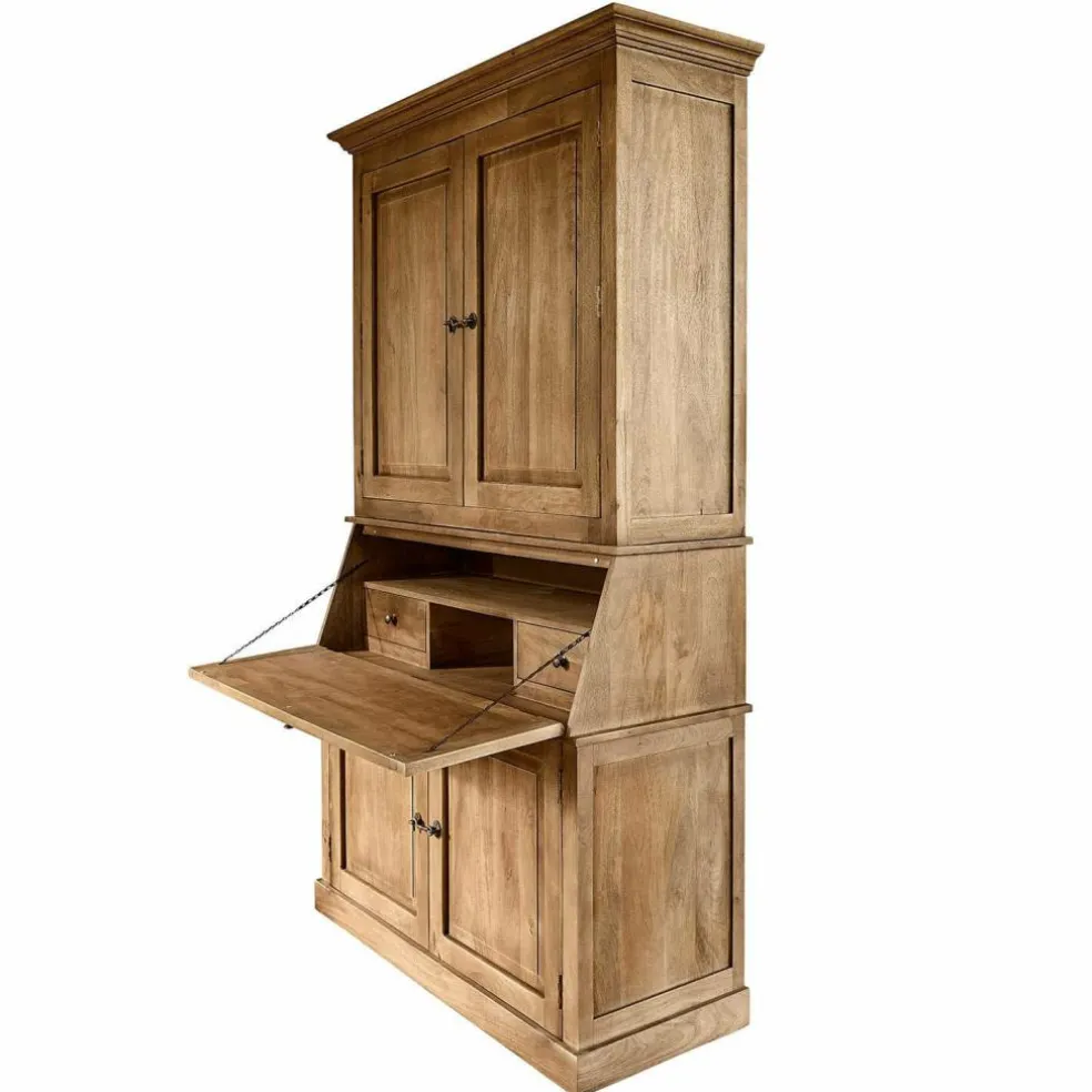 Ein schlicht imposanter Schrank im Landhausstil. Doch ihn nur Schrank zu nennen, wäre falsch. Er ist so viel mehr! Die aufklappbare Schreibfläche bietet Ihnen einen praktischen Arbeitsplatz, der bei Bedarf wieder diskret verschwindet. So stellen Sie ihn am besten in Ihr Arbeitszimmer. Gefertigt aus naturbelassenem Mangoholz, verbindet dieses Möbelstück die rustikale Schönheit der Natur mit höchster Handwerkskunst. Die sanft abgetönte Oberfläche fühlt sich angenehm an und betont die natürliche Maserung des Holzes. Die prachtvollen Kranzleisten setzen stilvolle Akzente und verleihen dem Sekretär eine majestätische Präsenz. Mit seinen zahlreichen Fächern und Ablagemöglichkeiten ist dieser Sekretär nicht nur ein funktionales, sondern auch ein dekoratives Highlight in Ihrem Zuhause.