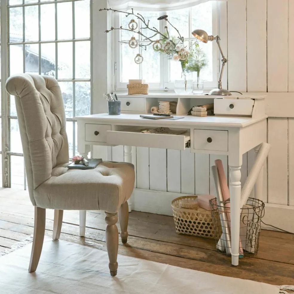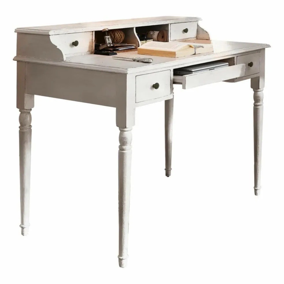 Dieser Sekretär wurde aus Naturholz gefertigt und in einem aufwendigen Verfahren mit Antik-Finish veredelt. Jeder Zentimeter seiner Oberfläche hat Charakter. Bei all der Schönheit, darf man den funktionellen Aspekt natürlich nicht vergessen. Neben der Schreiboberfläche stehen Ihnen vier Schubladen und zwei Ablagefächer zur Verfügung. Ganz oben befindet sich eine schmale Ablage und unter der Tischplatte ist ein Holzfaserbrett versteckt. Dieses lässt sich ganz bequem ein- und ausfahren – beispielsweise um eine Computertastatur darauf abzulegen.