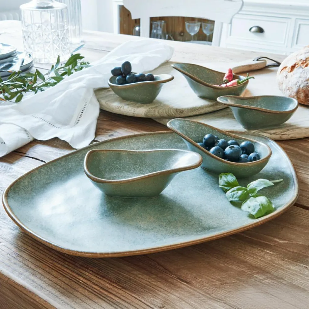 Ganz gleich, ob sie ihren Gästen einen kleinen Gruß aus der Küche senden oder Dips und Saucen besonders stilvoll anrichten möchten – dieses sechsteilige Set ist dafür prädestiniert. Es besteht aus fünf kleinen Schälchen und einem Unterteller. Es handelt sich um hochwertiges Steinzeug, das in traditioneller Handarbeit hergestellt wurde. Ein wunderschönes Detail sind die feinen, farbig abgesetzten Ränder, die hervorragend mit dem Grundton kontrastieren. Doch auch der unglasierte Boden ist ein schönes Detail. Präsentieren Sie Ihren Gästen Speisen oder Snacks in wundervoll charmanter Optik. Die unvollkommenen Rundungen und Unebenheiten verbreiten einen besonderen Charme, denn sie beweisen deutlich, dass diese Schälchen in aufwendiger Handarbeit entstehen.