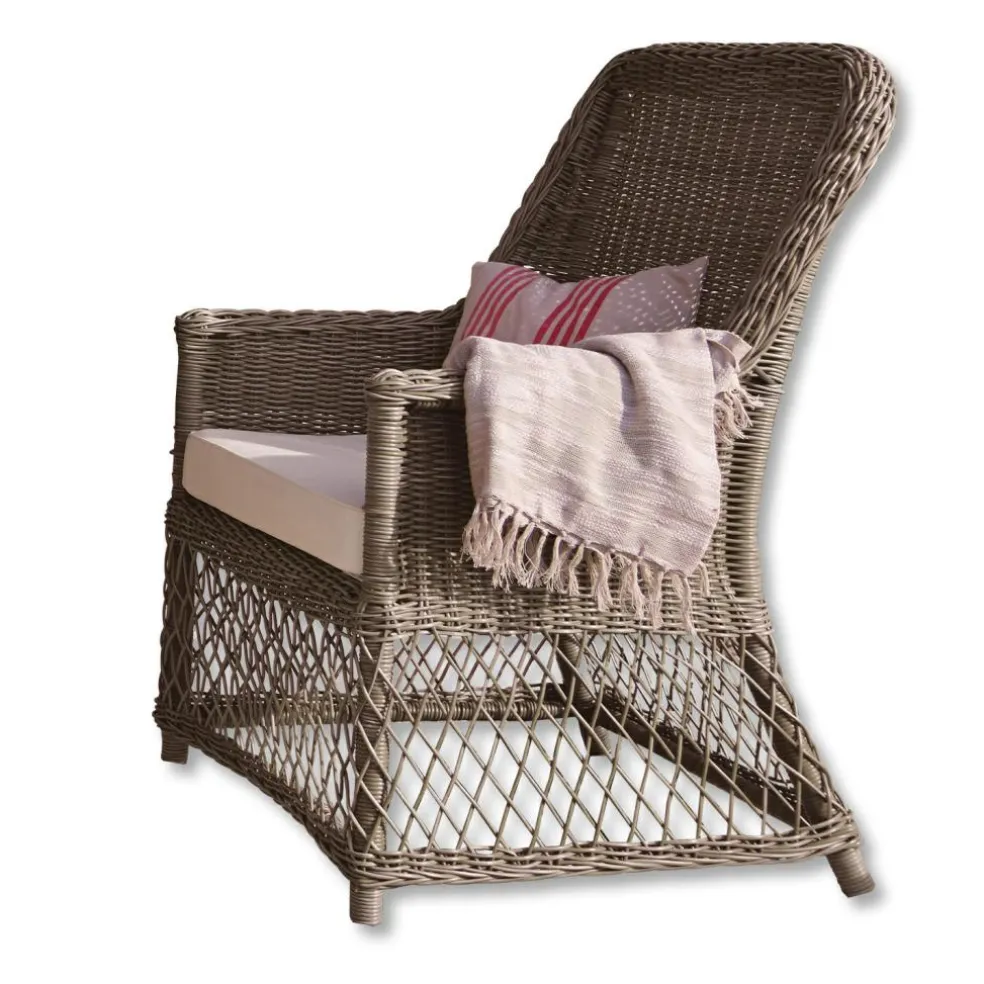Dieser wunderschöne Sessel ist in vielerlei Hinsicht besonders. Er ist absolut witterungsbeständig, lässt sich also von Wind und Wetter nichts anhaben. Selbst das Polster darf nass werden, da es zügig wieder trocknet. Das Gestell besteht aus einer robusten Alu-Konstruktion, die mit Porobustem Kunststoff ummantelt ist. Das Geflecht sieht aus wie echtes Rattan, ist aber deutlich widerstandsfähiger und wasserfest. Sie können den Sessel einfach mit einem Wasserschlauch abspritzen, um ihn zu reinigen. Natürlich lässt sich auch der Polsterbezug entfernen und in der Maschine waschen.