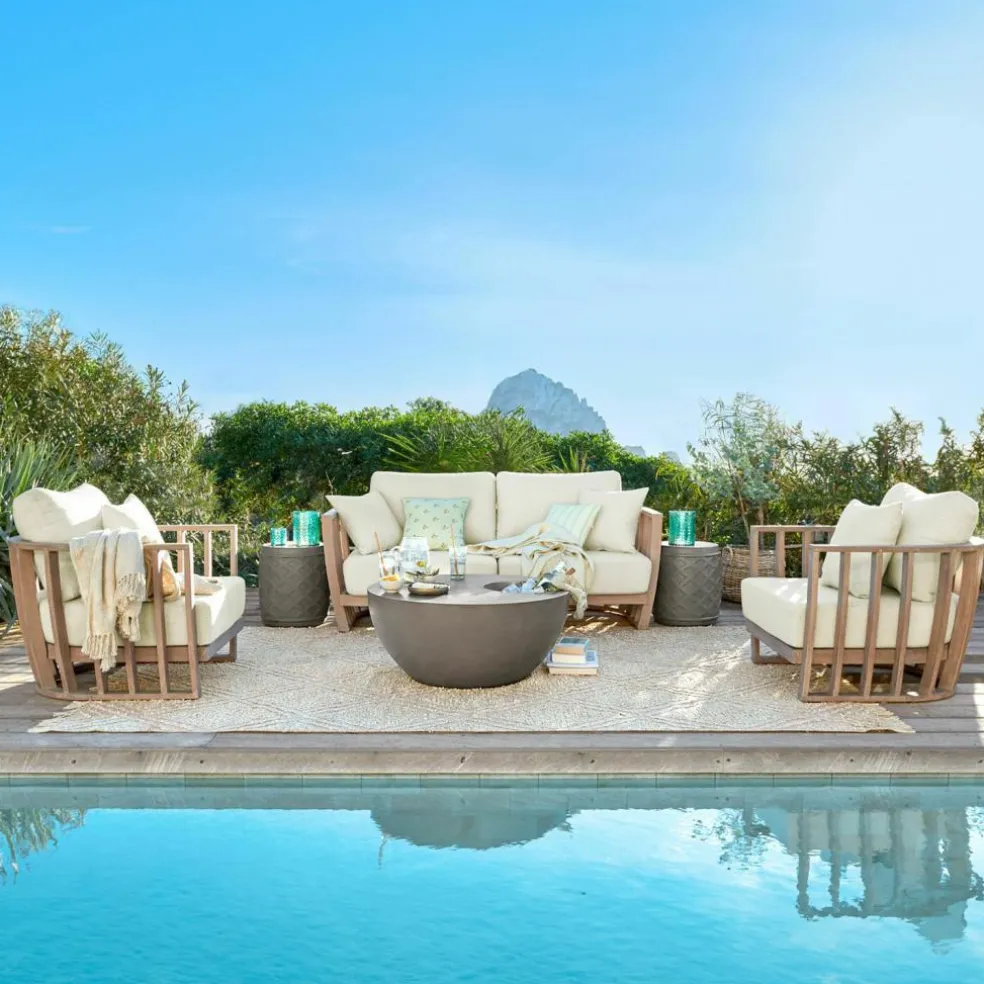Bei vielen Sesseln muss sich das Holz damit begnügen, unsichtbar unter der Polsterung für die Stabilität des Sitzmöbels zu sorgen. Hier aber darf es sich in voller Schönheit präsentieren und dem Sessel den charakteristischen Look geben. Massive Streben aus hochwertigem Eukalyptusholz bilden eine elegant geschwungene, runde Form, in der man äußerst bequem sitzt und wunderbar entspannen kann. Unter Insidern wird ein solcher Sessel als Banana chair bezeichnet, denn die umlaufende Lehne, die gleichzeitig als Arm- und Rückenlehne dient, erinnert Fantasiebegabte an eine Banane. Ein dezentes White-Washed-Finish betont die typische Maserung und lässt das Holz wie von der Sonne gebleicht aussehen. Und natürlich trägt das Holz das FSC®-Siegel, das garantiert, dass es aus nachhaltiger Waldwirtschaft stammt, bei der auch auf die Erhaltung der Ökosysteme und Artenvielfalt geachtet wird. Für den luxuriösen Sitz-Komfort im Sessel ist außerdem das Kissen-Trio zuständig, das aus je einem üppig gepolsterten Sitz-, Rücken- und Zierkissen besteht. Als Bezugsstoff für die Kissen wurde ein hochwertiges, strapazierfähiges Polyestergewebe gewählt. Und weil die Bezüge abziehbar und waschbar sind, werden Sie die schönen Stunden in diesem Sessel noch relaxter genießen.