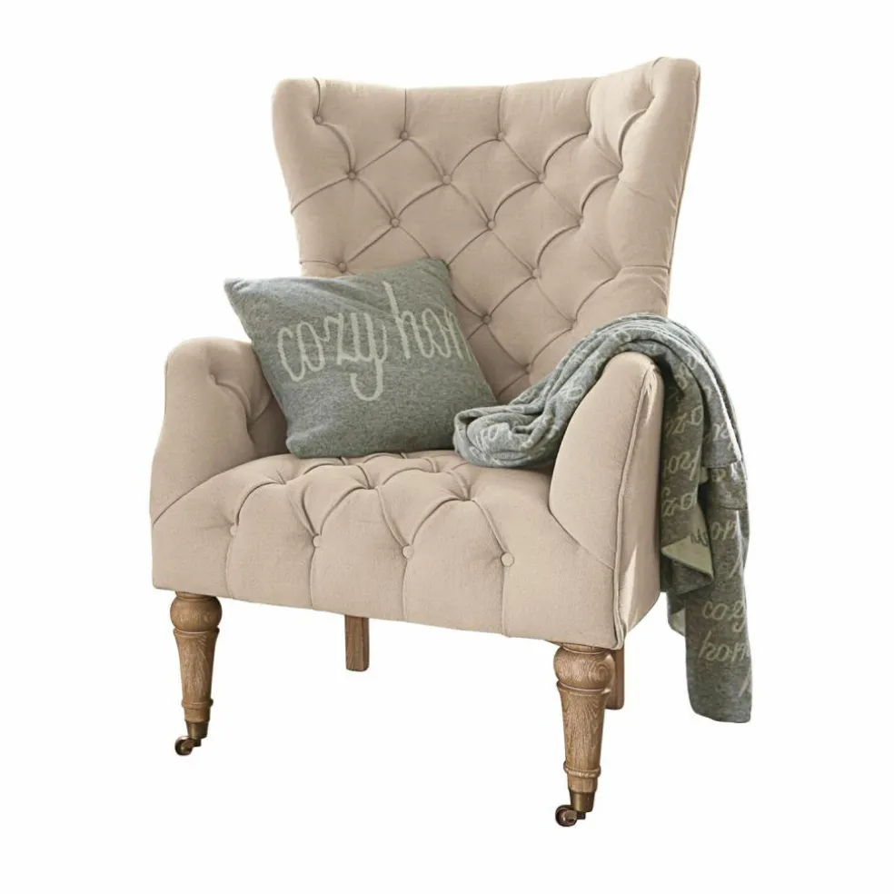 Der wunderschöne und großzügige Sessel im klassischen Design ist ein Traum für alle Liebhaber des Landhaus-Stils. Er bezaubert mit einer klassischen Chesterfield-Steppung und handgearbeiteten formschönen Füßen. Der Bezug besteht aus reinem Leinen, das für eine besonders natürliche Wohnatmosphäre sorgt. Die vorderen Füße wurden kunstvoll gedrechselt und sind mit kleine Rollen angebracht, sodass der Sessel sich ganz einfach drehen und platzieren lässt. Er setzt einen ausgesprochen eleganten Akzent in Ihrem Zuhause. Die komfortable Polsterung lädt zum Entspannen ein und die sanft geschwungene Form sorgt für eine extra Portion an Bequemlichkeit. Schöpfen Sie hier in aller Ruhe neue Kraft. Dieses edle und sehr hochwertige Design hat definitiv das Potential zum neuen Lieblingsplatz. Zeitlose Eleganz, die Sie viele Jahre lang begeistern wird.
