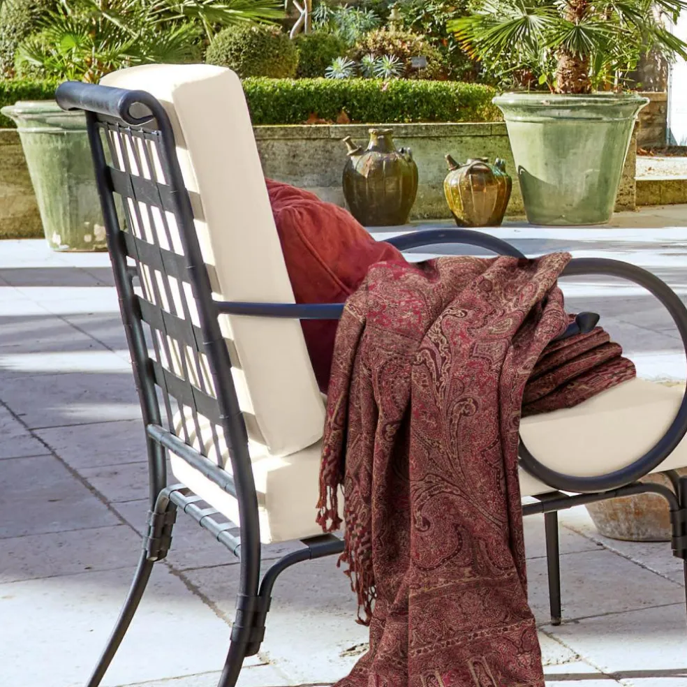 Eine wunderschöne Einheit aus Eleganz und Beständigkeit im französischen Stil: Die Sitzgruppe besteht aus zwei Sesseln (16584) und einem Sofa (19512) und verkörpert die innige Liaison aus Komfort und klassischer Schönheit. Die aparten Möbel bestechen durch ihre einnehmende Optik mit einer ausgewogenen Mischung aus geraden und geschwungenen visuellen Elementen. Dabei sind sie sehr witterungsbeständig. Dies verdankt sich zum einen dem Gestell aus Eisen, zum anderen den Kissenbezügen aus Olefin, das nicht nur wunderbar weich ist, sondern auch pflegeleicht, outdoorfähig, UV-beständig und wasserabweisend. Die stilvolle Gruppe macht in Außenbereichen wie Garten oder Terrasse eine ebenso gute Figur wie im Wintergarten und lädt ein zu geselligen Runden mit Freunden oder natürlich der Familie. Freuen Sie sich auf sonnige Zeiten in diesem außergewöhnlichen und langlebigen Ensemble.