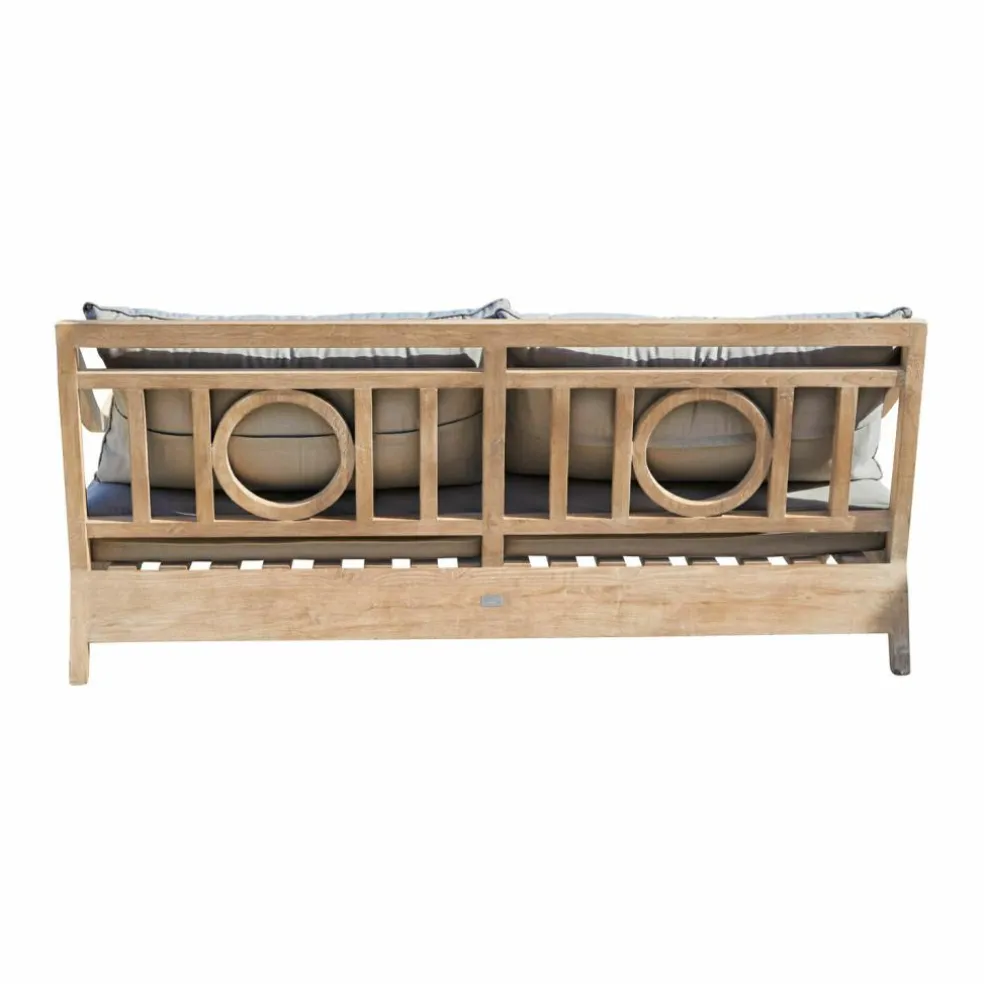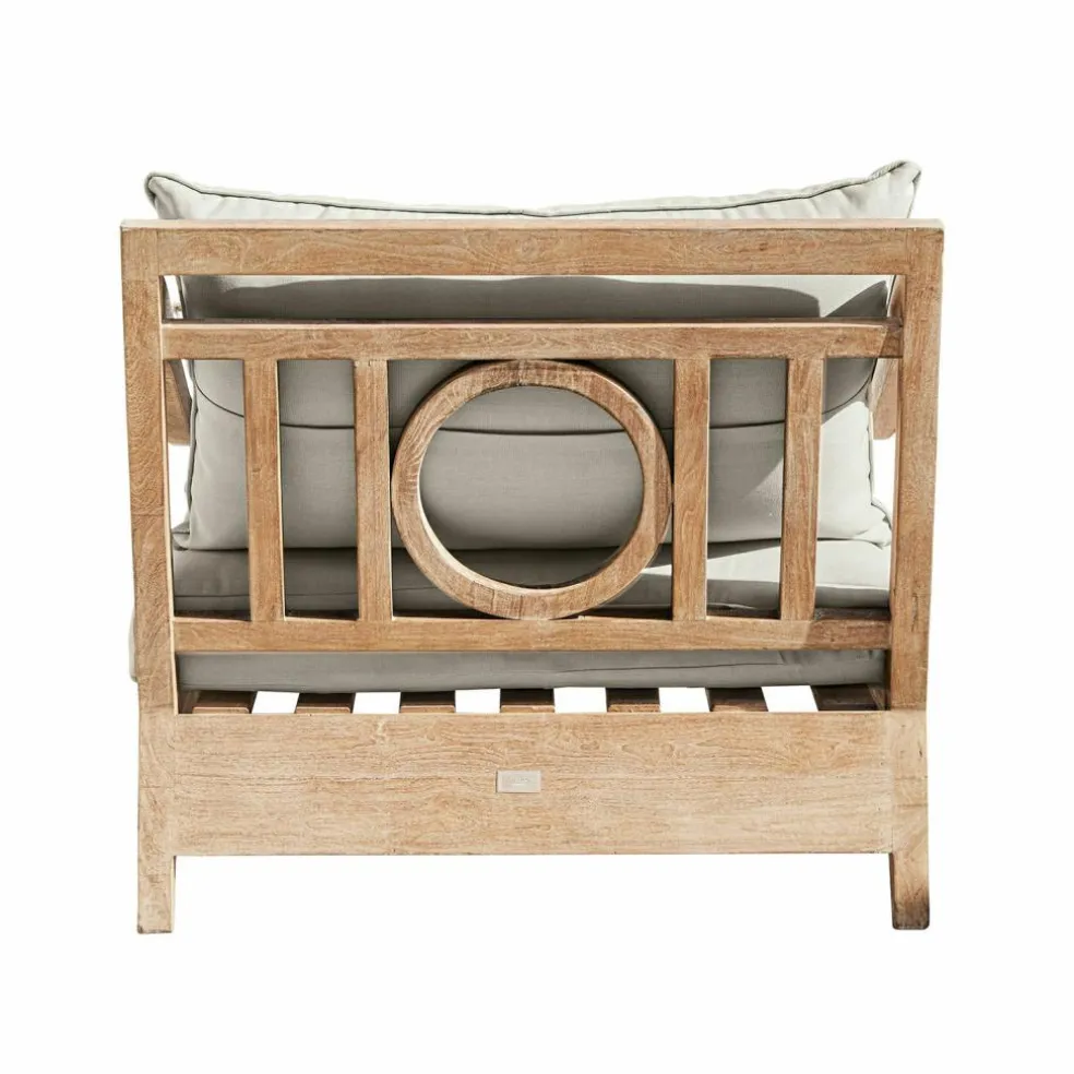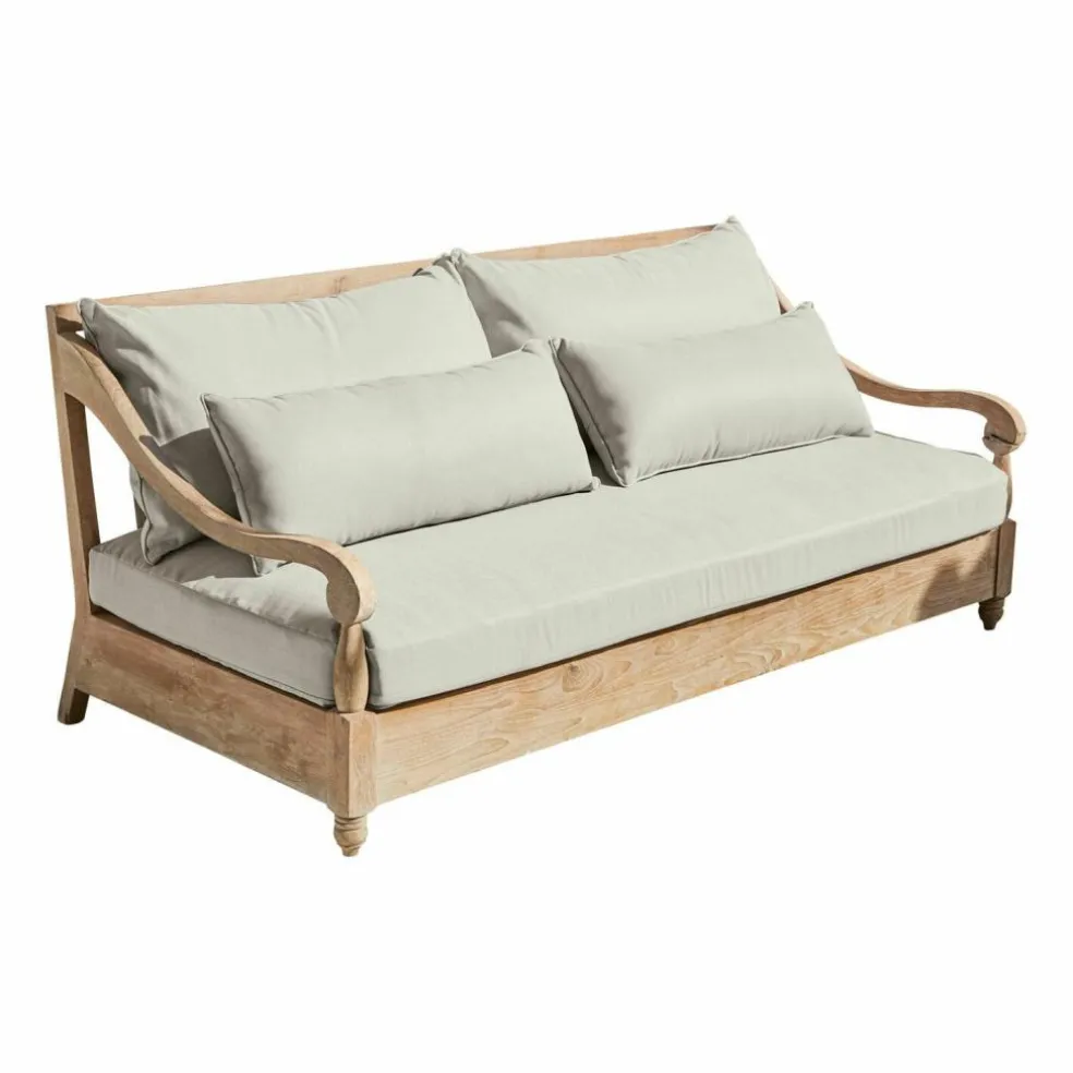 Wenn sich am Morgen ein himmelblauer Sommerhimmel über Ihrem Garten wölbt, wissen Sie, dass Sie jetzt wieder einen jener kostbaren Tage erleben werden, an denen sich entspanntes Urlaubs-Feeling einstellt, sobald Sie die Terrasse betreten. Vielleicht nehmen Sie schon Ihren Cappuccino in der Sitzgruppe ein, vielleicht gönnen Sie sich am Nachmittag ein gemütliches Stündchen auf dem Sofa, auf jeden Fall aber lassen Sie den Tag dort ausklingen, solo, zu zweit oder mit Gästen. An der heiter gelösten Stimmung jener Stunden hat die Sitzgruppe einen nicht unerheblichen Anteil, denn sie verbreitet das stilvolle Flair eines gastlichen Hauses und verwöhnt alle mit luxuriösem Sitzkomfort. Und wie die weichen Sitz- und Rückenpolster zum Platznehmen und Verweilen einladen, zeugen die aufwendig gearbeitete Rückseite, die elegant geschwungenen Armlehnen und die liebevoll gedrechselten Füße von der Passion des Künstlers für sein Handwerk. Und mit dieser Sitzgruppe hat er ein Meisterstück geliefert. Das wiederaufbereitete Teakholz sorgt nicht nur für die gute Wetterbeständigkeit der Sitzgruppe, sondern kann durch das dezente White-Washed-Finish auch eine besonders ausdrucksstrake Maserung zeigen. Die Kissen haben einen Outdoor-geeigneten Bezug mit Abperleffekt, was ihn also wasserabweisend macht. Die Bezüge lassen sich bei Bedarf auch gerne abnehmen. Noch ein praktisches Detail: Die Sitzkissen werden mit Klettbändern an den Latten fixiert.