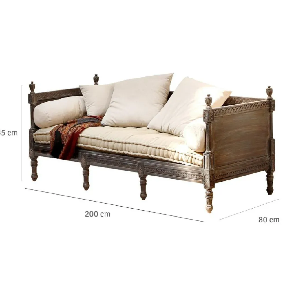 Ein Sofa, das auch in einem marokkanischen Patio stehen könnte! Ornamentale Schnitzereien und die schönen Abschlußknäufe bestimmen den orientalischen Stil. Praktisch auch mal als Gästebett und für die Siesta zwischendurch. Acht Beine sorgen für Stabilität.