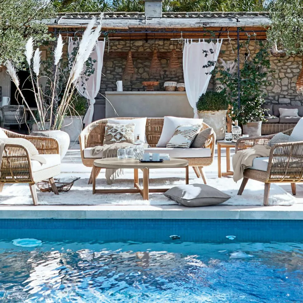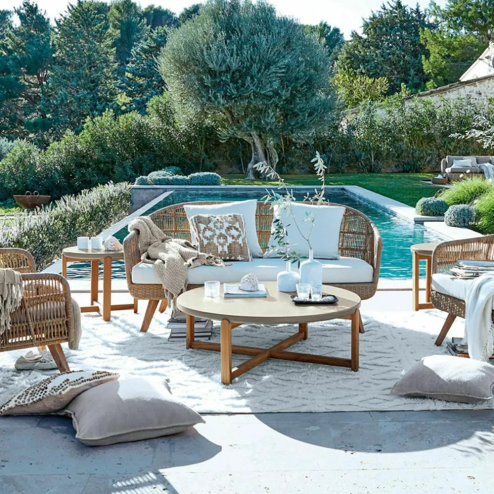 Mit modernem Design und einer guten Prise Leichtigkeit begeistert dieses hochwertige Sofa. Hier geht ein stabiles Aluminiumgestell mit einem aufwendig gestalteten Geflecht aus Polyethylen – eine robuste und wetterfeste Alternative zu Natur-Rattan – eine gelungene Verbindung ein. Die gerundete Arm- und Rückenlehne wirkt ausgesprochen einladend, dazu kommen ein weich gepolstertes Sitzkissen und zwei Rückenkissen, die gemütlichen Komfort schenken. Alle Webbezüge sind UV-resistent und lassen sich zum Waschen abziehen. Ein außergewöhnlich schönes Möbelstück, das Ihr Zuhause mit viel Stil bereichert und zum stundenlangen Verweilen einlädt – ob im Wohnzimmer, Wintergarten, auf dem Balkon oder der Terrasse. Mit einem Landhaus- oder orientalisch anmutendem Ambiente verträgt sich das Loungesofa besonders gut und kann mit dem Sessel Nr. 21919 ergänzt werden. Als bereits kombinierte Sitzgruppe (22037) können Sie Sessel und Sofa auch im Set erhalten.
