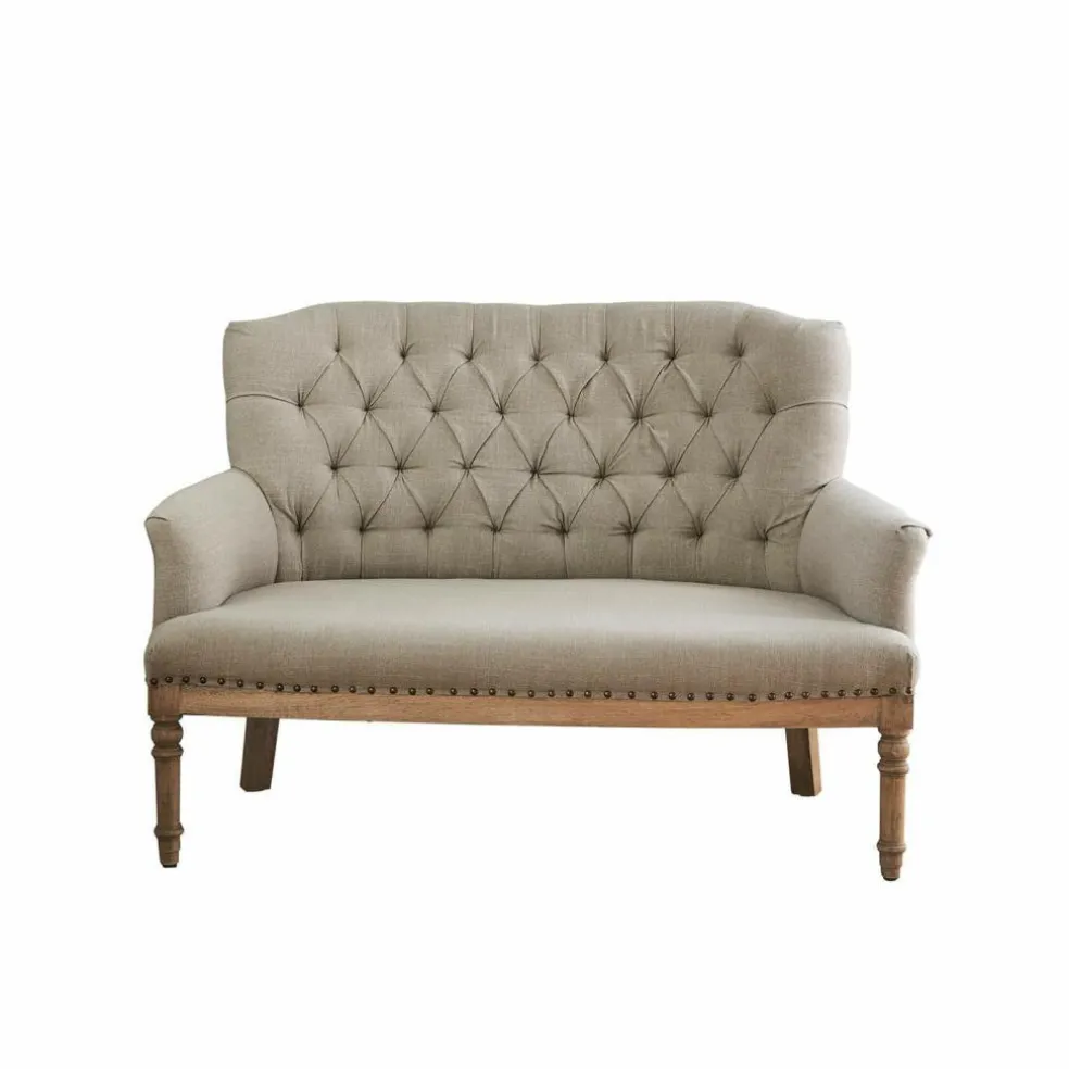 Platz für zwei bietet dieses edle Sofa, das nach englischen Vorbildern von erfahrenen Polsterern gefertigt wird. Sie beherrschen unter anderem die klassische Chesterfield-Steppung mit Polsterknöpfen, die hier die Rückenlehne auf elegante Weise betont. Das Möbel ist weich gepolstert und mit einem robusten und ansprechend strukturierten Webstoff bezogen. Ausgesprochen formschön sind die leicht geschwungenen Lehnen, die wie eine einladende Umarmung wirken. Und die angenehm tiefe Sitzfläche ist so bequem, dass man stundenlang verweilen möchte. Ziernieten aus Messing und das stabile Untergestell aus Mangoholz mit gedrechselten Beinen machen das Bild vollkommen. Vintage-Chic der exquisiten Art – ein stilvolles Schmuckstück für das Wohnzimmer, Gästezimmer oder Kaminzimmer.