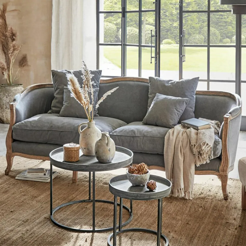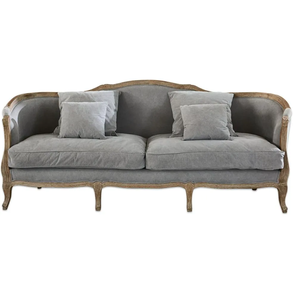 Französischer Chic, der begeistert. Dieses wunderschöne und hochwertige Sofa ist Luxus pur. Das stabile, französische Gestell besteht aus Eichenholz, welches ein schönes Antik-Finish ziert. Die abziehbaren Bezüge haben einen Reißverschluss und sind so leicht zu reinigen. Inklusive sind zwei abnehmbare Sitzkissen sowie vier kuschelige Zierkissen in zwei Größen. Nehmen Sie Platz und genießen Sie die herrlich gemütliche Polsterung. Das edle Stück sieht ausgesprochen stilvoll aus und adelt jedes Ambiente, ob Landhaus oder Shabby-Chic. Hieran haben Sie viele, viele Jahre lang Freude. Der zeitlose Stil kommt niemals aus der Mode. Ein echtes Prachtstück für Ihr Zuhause.