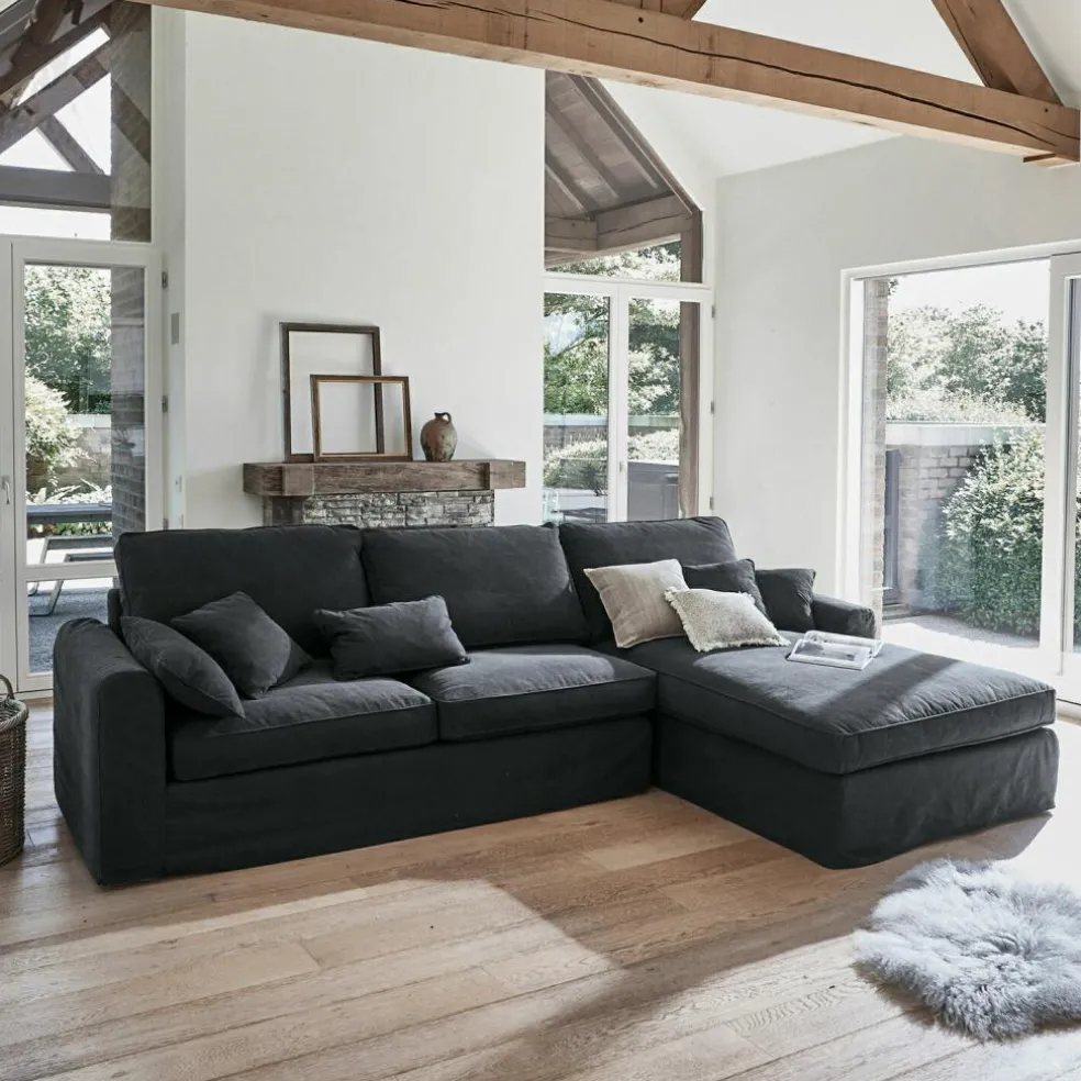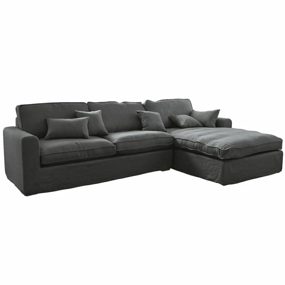 Wieso Ausgehen? Bleiben Sie einfach daheim. Mit diesem Sofa verwandeln Sie Ihr Wohnzimmer in einen absoluten Hot-Spot. Die große Couch mit eingebauter Récamière auf der rechten Seite besteht aus einem stabilen Massivholzgestell und einer hochwertigen Schaumstoffpolsterung – genug Platz zum Ausstrecken inklusive. Darüber hinaus punktet das Sitzmöbel mit einem schönen Bezugsstoff aus reinem Leinen, einer exzellenten Verarbeitung und acht zusätzlichen Kissen mit aufwendig gearbeiteten Kedernähten. Dieses Sofa ist noch in weiteren Farben bei uns erhältlich und in der Variante mit der Ecke auf der linken Seite. Sie haben die Wahl!