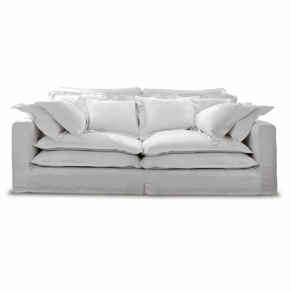 Zu behaupten, es handle sich hier um den Rolls Royce unter den Sofas, wäre sogar noch untertrieben. Es handelt sich um ein wirklich prächtiges Modell, das in Sachen Design, Funktionalität und Komfort seinesgleichen sucht. Da wäre zum einen die großzügig dimensionierten Sitztiefe von 122 Zentimetern, welche zum gemütlichen Verweilen einlädt. Nicht nur ein, sondern gleich zwei Sitzkissen stapeln sich auf jeder Seite, um ein Maximum an Gemütlichkeit zu erreichen. Dazu kommen zwei Rückenkissen und neun Zierkissen, die sich den eigenen Wünschen entsprechend platzieren lassen. Diese Couch ist quasi eine paradisische Liegewiese. Das Gestell ist aus robustem Tannenholz gezimmert und formstabil mit Federkern gepolstert, der Bezug ist abnehmbar. Smartes Detail: Seitlich sind Fächer angebracht für TV-Zeitschriften, Fernbedienungen und so weiter.