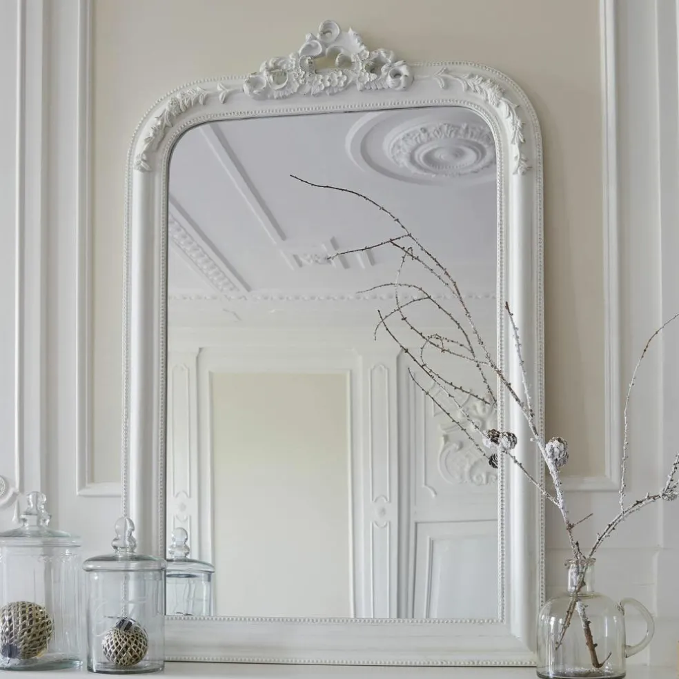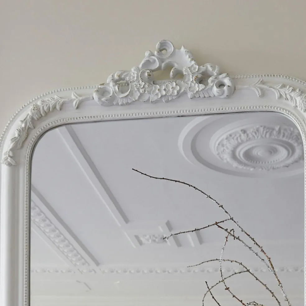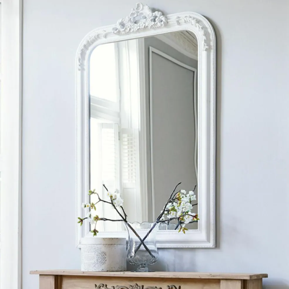 In vielen Wohnungen überwiegen heutzutage funktional minimalistische Interieurs. Doch manch einer sehnt sich nach eleganter Wohnlichkeit, nach edlen Hölzern und nach Möbeln, deren kunstvoll gearbeitete Details auch die Liebe des Erbauers zu seinen Werken erkennen lassen. Dieser Spiegel erinnert mit seiner beschwingten Formgebung und den üppigen Verzierungen an die Fenster der Belle Epoque, als es auch in der Architektur nicht prunkvoll genug zugehen konnte. Der mit einem feinen Perlenband geschmückte Rahmen ist aus Paulowniaholz gefertigt, einem Edelholz, das sehr hart und widerstandsfähig ist und gerne für hochwertige Möbel und Musikinstrument benutzt wird. Eine Besonderheit: Die floral anmutenden Schmuckelemente sind nicht aus Holz geschnitzt, es handelt sich vielmehr um kunstvolle Stuckarbeiten, wie sie zu jener Zeit an den Wänden und Decken eleganter Salons beliebt waren und in manchen Wohnungen und Häusern auch heute noch zu bewundern sind. Das antikweiße Finish ergänzt die nostalgische Ausstrahlung und macht die Blickfangwirkung dieses luxuriösen Prunkstückes perfekt. Sie können den Spiegel auf einer Kommode oder Konsole an die Wand lehnen, Sie können ihn mit Hilfe der 2 Haken auf der Rückseite aber auch aufhängen – im Eingangsbereich des Hauses, im Wohnraum oder auch im Schlafzimmer.