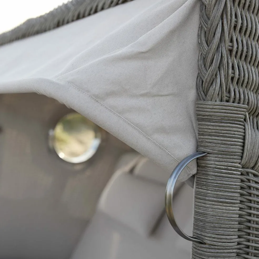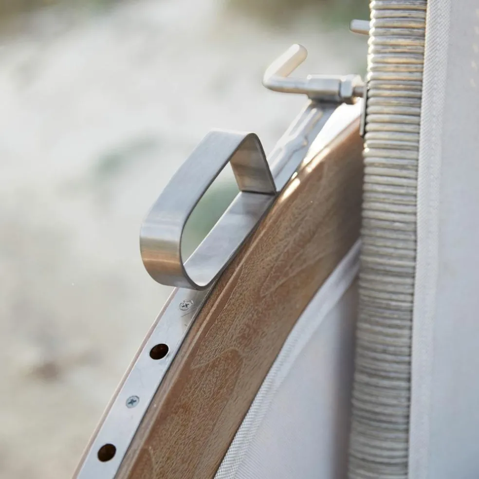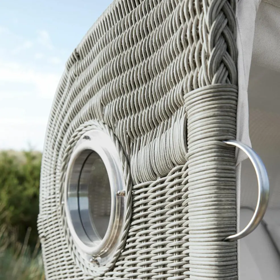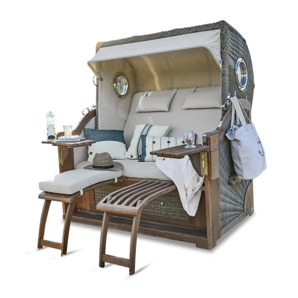 Dem Rauschen des Meeres lauschen, gut vor Sonne und Wind geschützt die Freizeit genießen, ein romantisches Strand-Picknick mit Champagner und Beeren und entspannt ein gutes Buch lesen – zum perfekten Urlaub am Meer gehört für viele ein komfortabler Strandkorb einfach dazu. Mit diesem Modell holen Sie sich eine absolute Luxus-Variante ins Haus, beziehungsweise in den Garten oder auf die Terrasse. Das Gestell ist aus sehr langlebigen Materialien wie Teakholz und Aluminium gefertigt. Die wunderschön geflochtenen Partien und die seitlichen Bullaugen unterstreichen den authentischen Küsten-Charme. Beim Design wurde neben dem hohen Qualitätsanspruch aus sehr viel Wert auf höchsten Komfort gelegt. Die zahlreichen und gut durchdachten Details lassen keine Wünsche offen. Die Beine können dank der abnehmbaren Fußstützen hochgelagert werden. Die bequemen Kissen mit robusten Synthetikbezügen laden zum Anlehnen und Verweilen ein. Schwenkbare Tische eignen sich perfekt für Getränke oder Snacks. Unter den Fußstützen befindet sich eine zusätzliche Schublade. In diesen kann alles untergebracht werden, was Sie für den perfekten Urlaubstag zu Hause benötigen. Unter anderem eben auch die Fußstützen, die hier gut verstaut werden können. Sonnencreme, Lektüre, Sonnenbrille und vielleicht ein leichtes Jäckchen können hier sicher und stets greifbar verstaut werden. Wer das maritimes Lebensgefühl liebt, wird in diesem traumhaft schönen Teil den perfekten Begleiter für den Sommer finden.